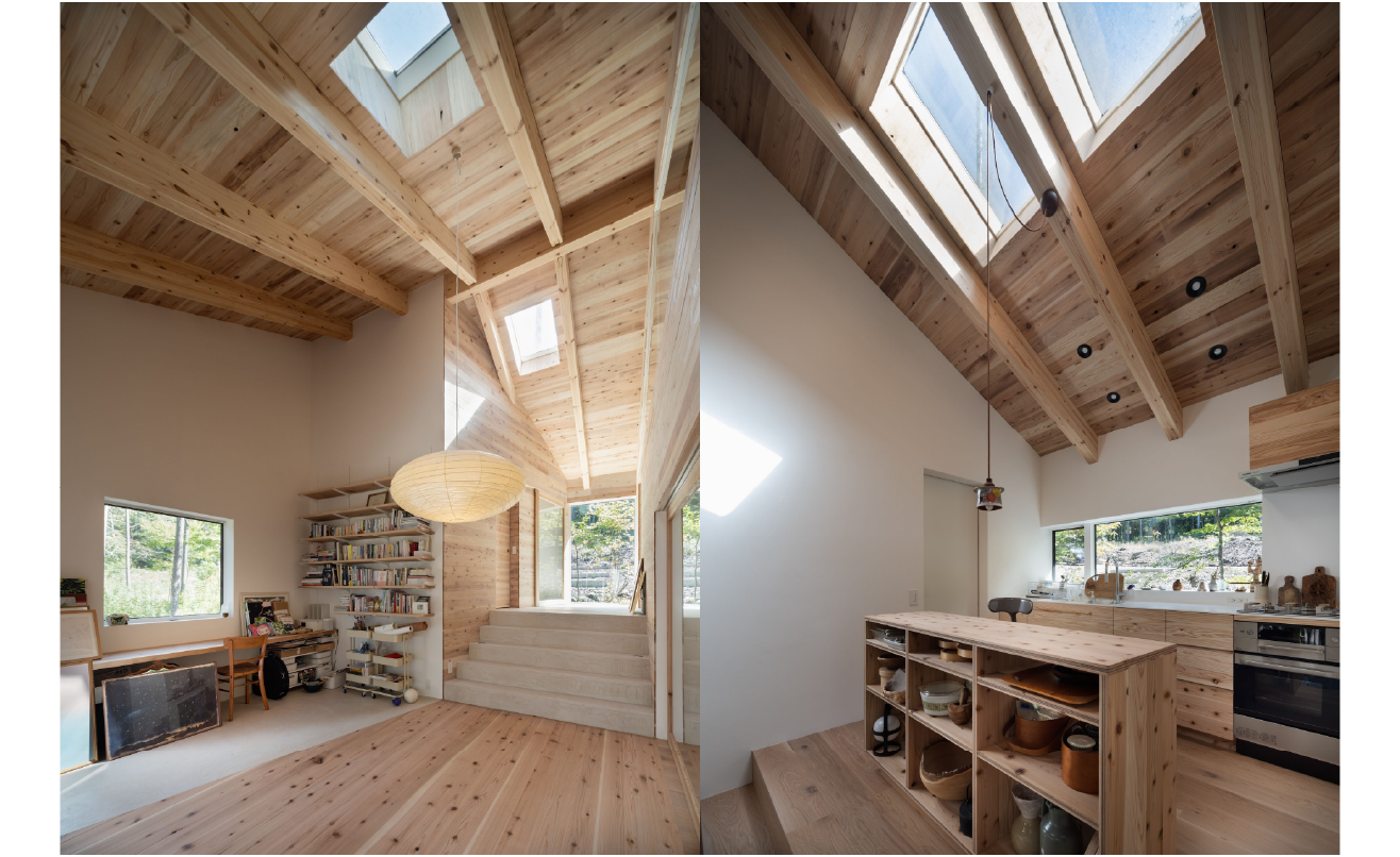 特筆すべきは森から伐り出した木を乾燥させて使用した天井材やキッチン。同地の木という地産地消の素材選びが一体感を与え、森と住まいを地続きに感じさせています。