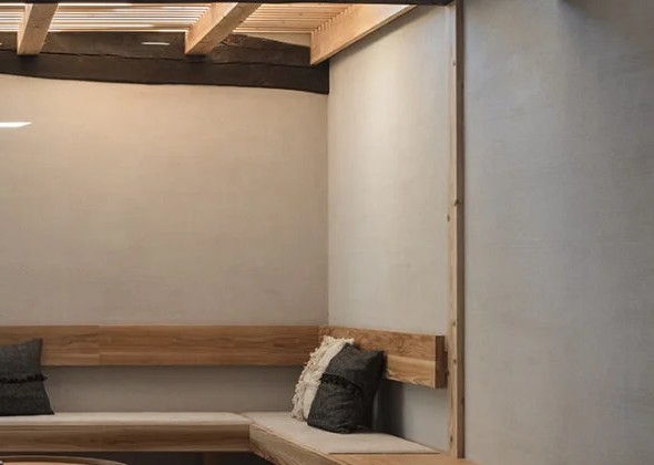 大工や家具職人によって造作した家具は、梁の力強さに負けないよう大ぶりなデザインに。ベンチや棚は座る・収納する・飾ると多用途に対応できます。
