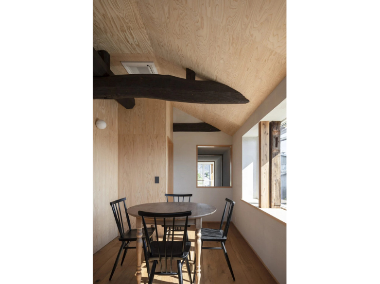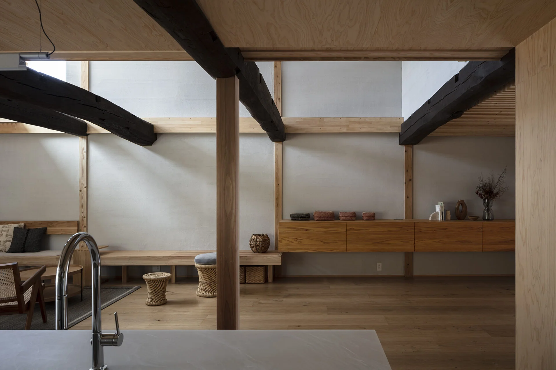 もともと建物の構造状態が万全ではなく、耐震性に不安がありました。そこで、既存の柱の内側にもう一本新たに補強柱を立ててつなげることで、現行法規程度の耐震強度を確保しています。新しい梁は古い梁の質感に合わせることで、補強でありながらデザインの要素としても活かしています。さらに、インナーフレームの一部をあえて見せ、補強した柱の一部を真壁として現すことで、空間にアクセントを与えます。