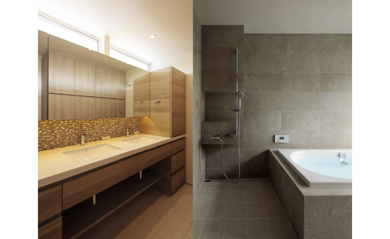 洗面室は女性が多いことから広く設計され、鏡も大きく清潔感に溢れた空間に。