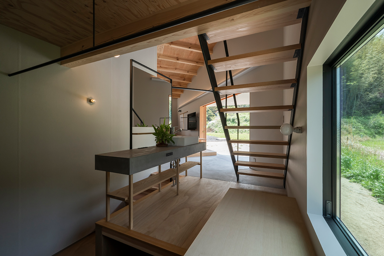 この住まいは「くの字」に曲がった形を持ち、敷地内に約60cmの高低差があります。その形状と段差を活かして室内を構成しました。