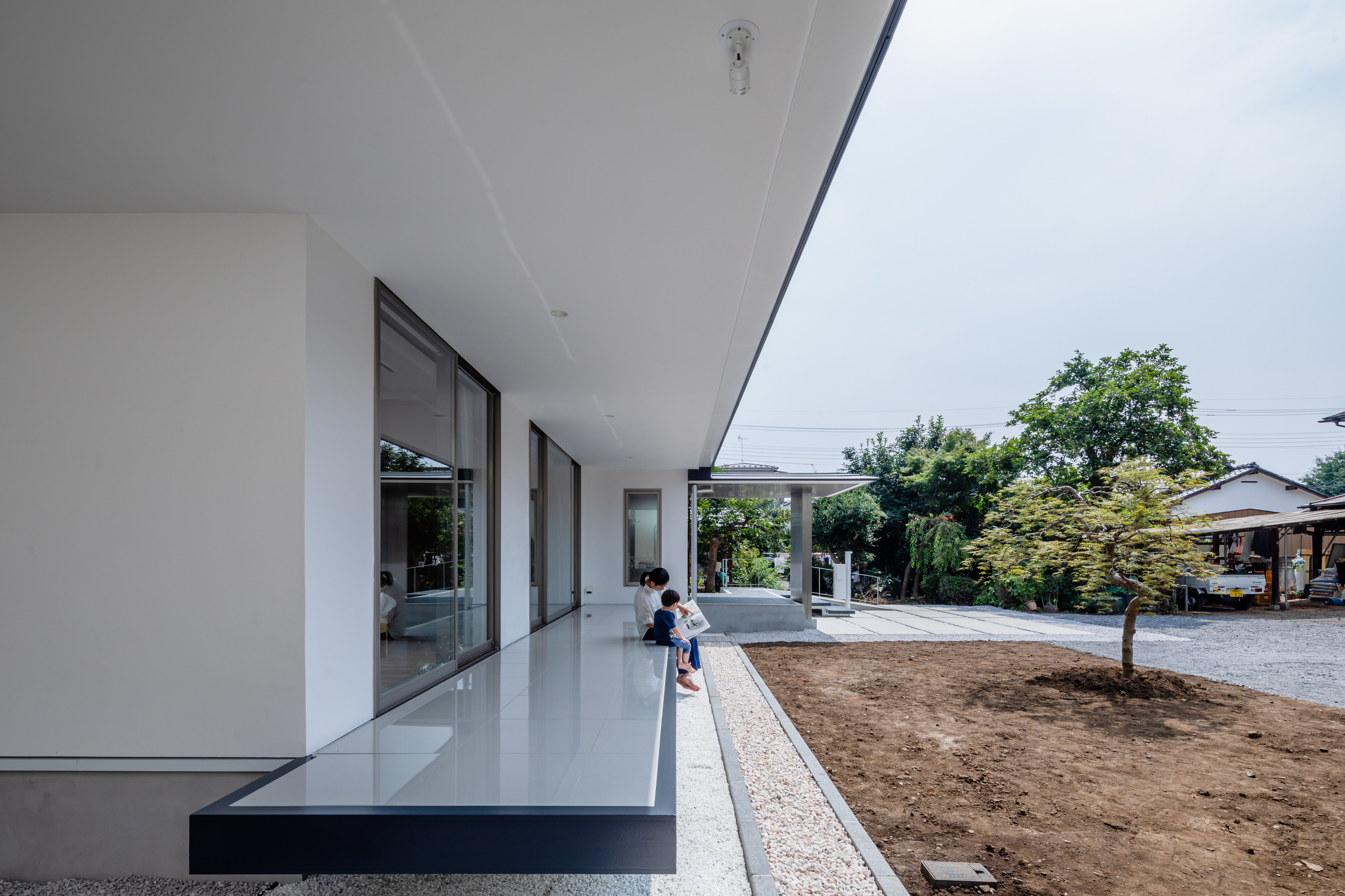 明るく風が抜ける大開口の家を創る際に、余計な熱は取り込まないように断熱を考える必要があります。写真の『東新井の家』の縁側もそんなことを意識しながら創りました。施主の要望もあり、作業やコミュニケーションの場となる広々とした縁側がある設計なのですが、日射しや雨から守るためひさしが深くなっています。これにより直射日光の熱などから室内を守れますが、それだけでは今度は室内が暗くなりがちという問題が生じます。そこで縁側の床に木ではなく、光を柔らかく反射するタイルを採用しました。これにより熱は遮りつつも優しい光を室内に届けることができます。加えて、窓も断熱性能の高いサッシを使用し、外壁にも断熱性能のある塗り材を使用して建物の断熱性を高くしました。タイルの縁側はウッドデッキ等と比較して手入れがしやすい点もメリットだと思います。このように、素材が持つ特性を活かすことで、光の入り方や室内の明るさを変えることも可能です。