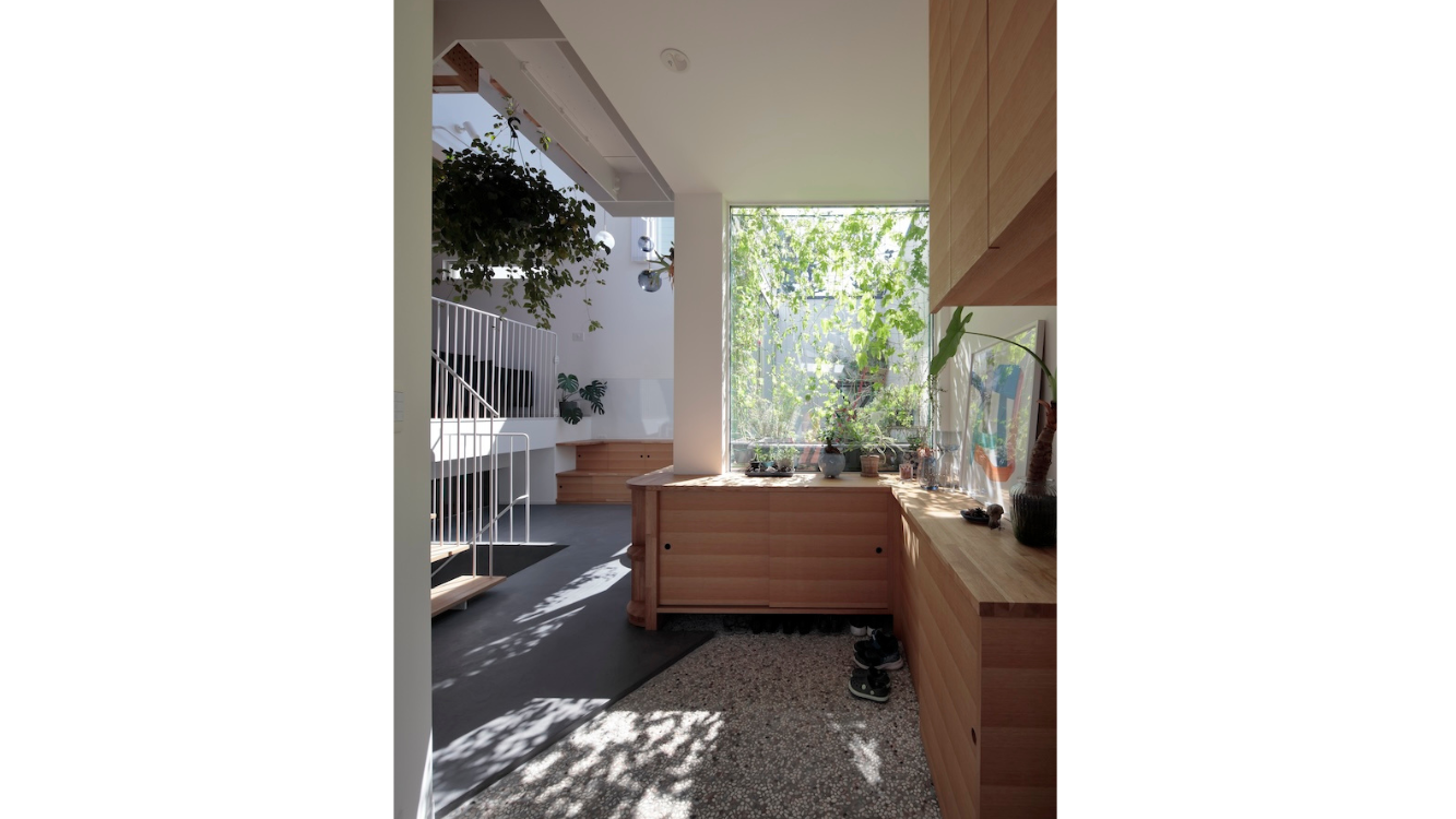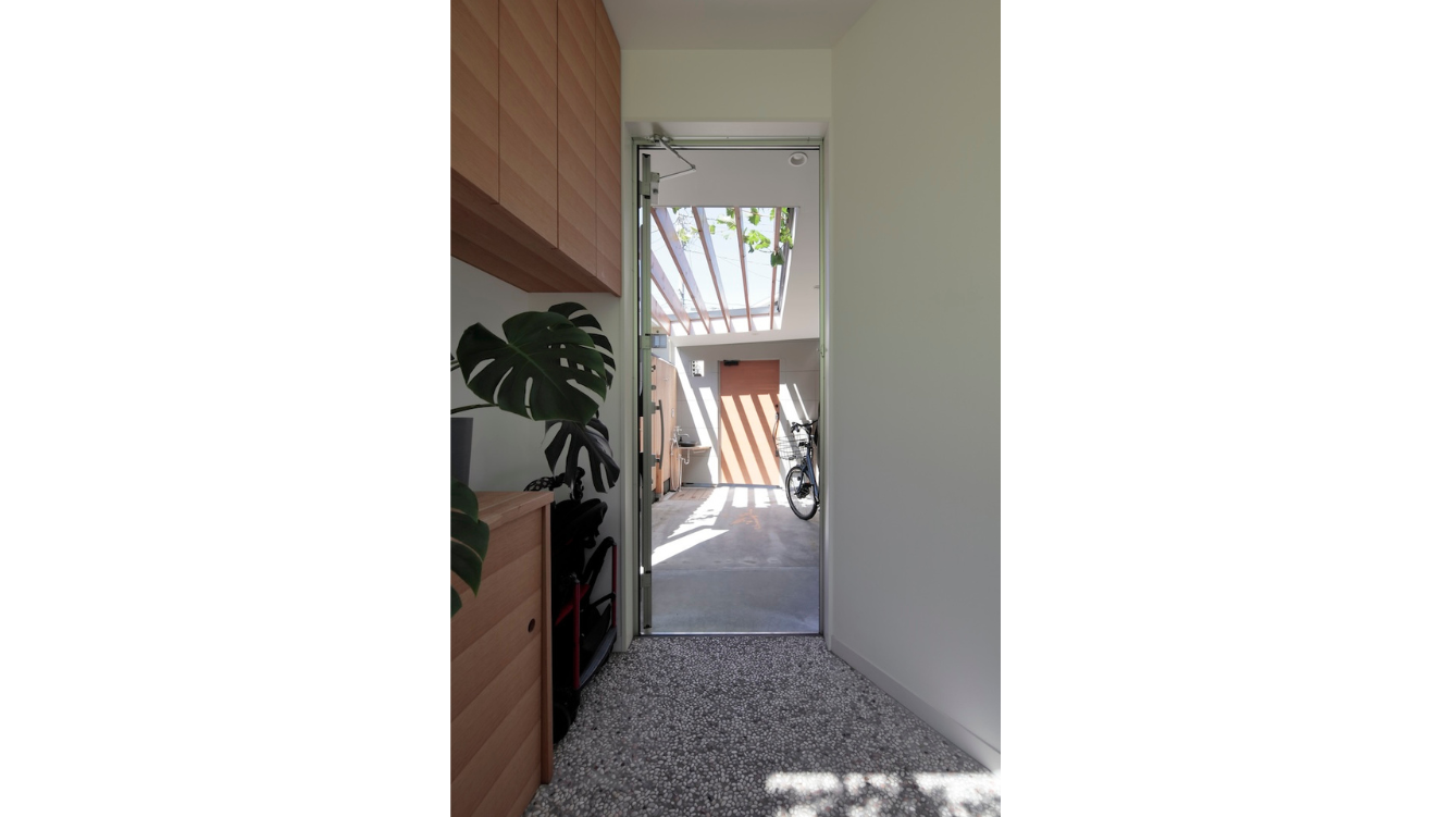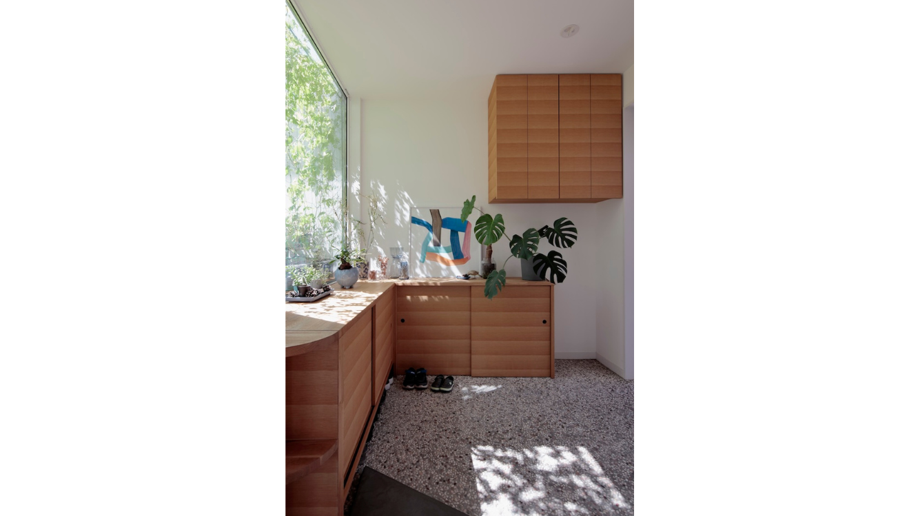 そこで、上から差し込む光を活かすとともに、玄関アプローチに余白を設けることで、外との程よい距離感をつくっています。玄関と道路の間に緩衝空間を設けたことで、空間的にも心理的にも余裕が生まれ、自然や光を意識できる場所になりました。