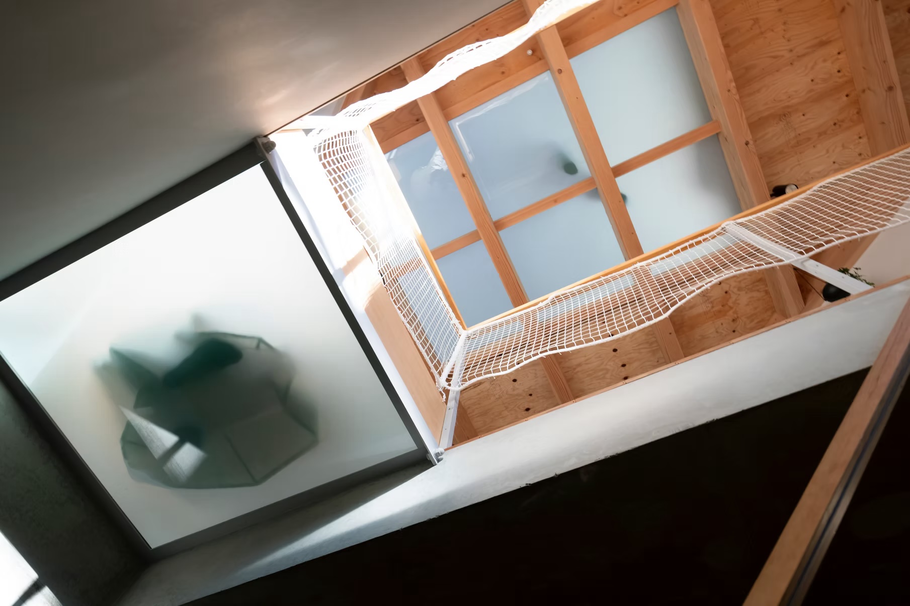 建物の中心には階段を据え、上下階を緩やかにつなぐ軸としました。玄関を入ると、土間と小上がりの2つのゾーンが現れ、この家の立体的な広がりを予感させます。1階にはキャンプ道具を収める土間収納を設け、趣味を暮らしに取り込む場としています。