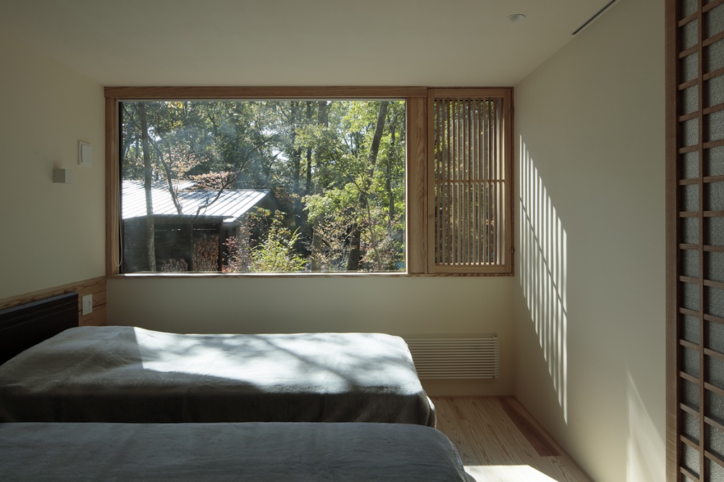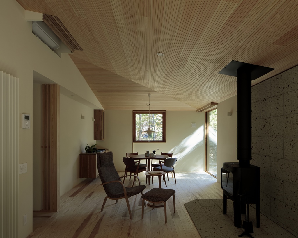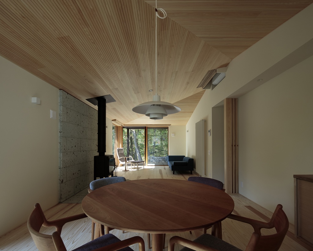 建築家は土地探しの段階から計画に関わり、敷地の形状や周辺環境を丁寧に読み取り、整った別荘地の中にありながら、周囲の建物との距離や森の見え方を考慮し、落ち着いた佇まいと暮らしを実現しています。