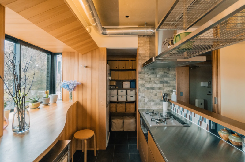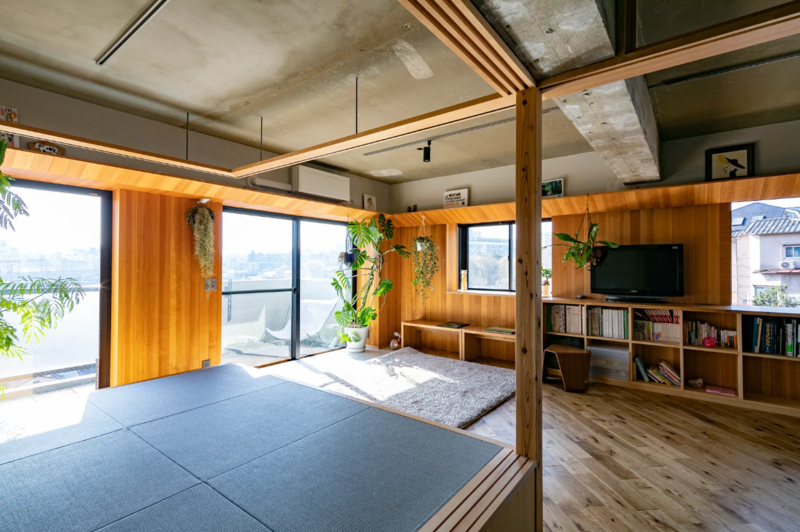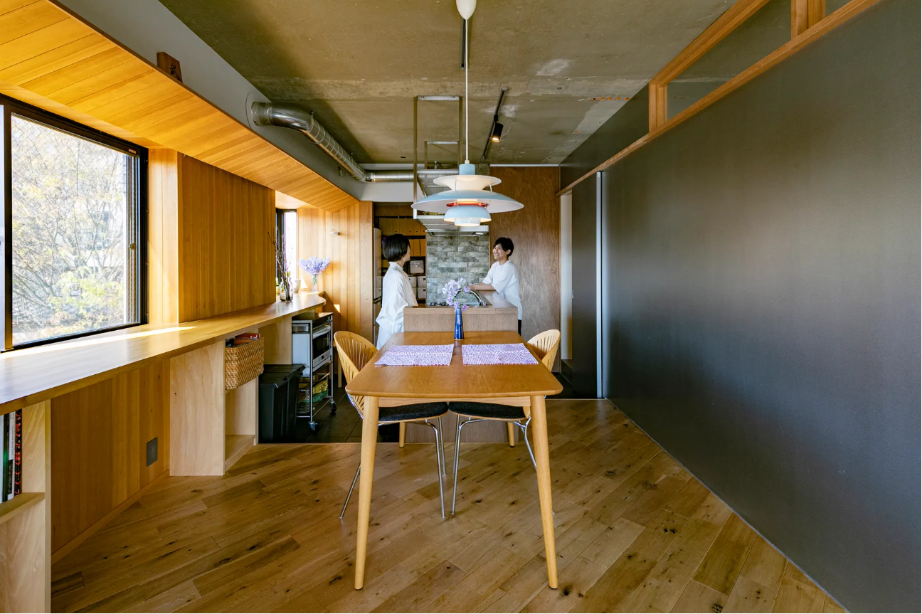 住まい全体をワンルームに近い構成へと変更し、もともと5つ並んでいた窓を単なる開口の連なりではなく「大きな一枚の窓」としてデザイン。ヘムロックの木の板を連続して設けることで、部屋全体がやわらかな光に包まれた大きな窓辺空間となり、外とのつながりや景色を感じるさまざまな居場所が生まれました。