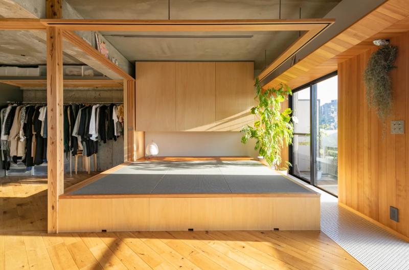 天井には既存のコンクリートをそのまま現しとし、自然素材と素地の質感を対比させることで、この部屋ならではの質感をつくり出しました。