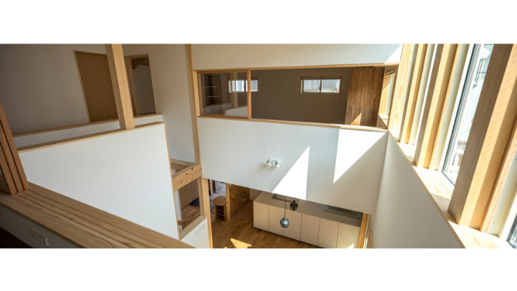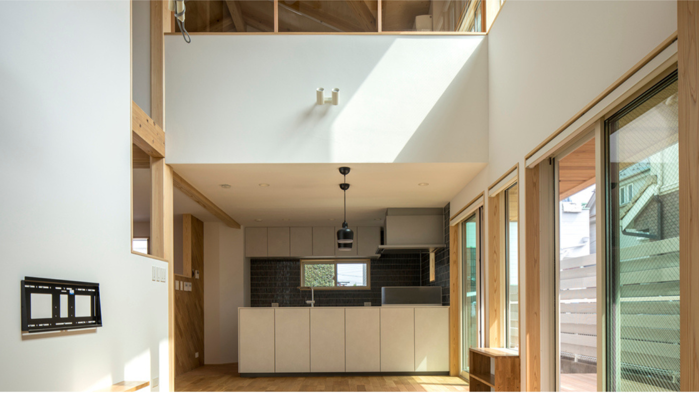 家の中心に光と風を取り込み、吹き抜けを介して各部屋がゆるやかにつながります。室内窓を通して二階の親子が声をかけ合い、さらに吹き抜けを通じて一階のLDKとも気配が交わります。