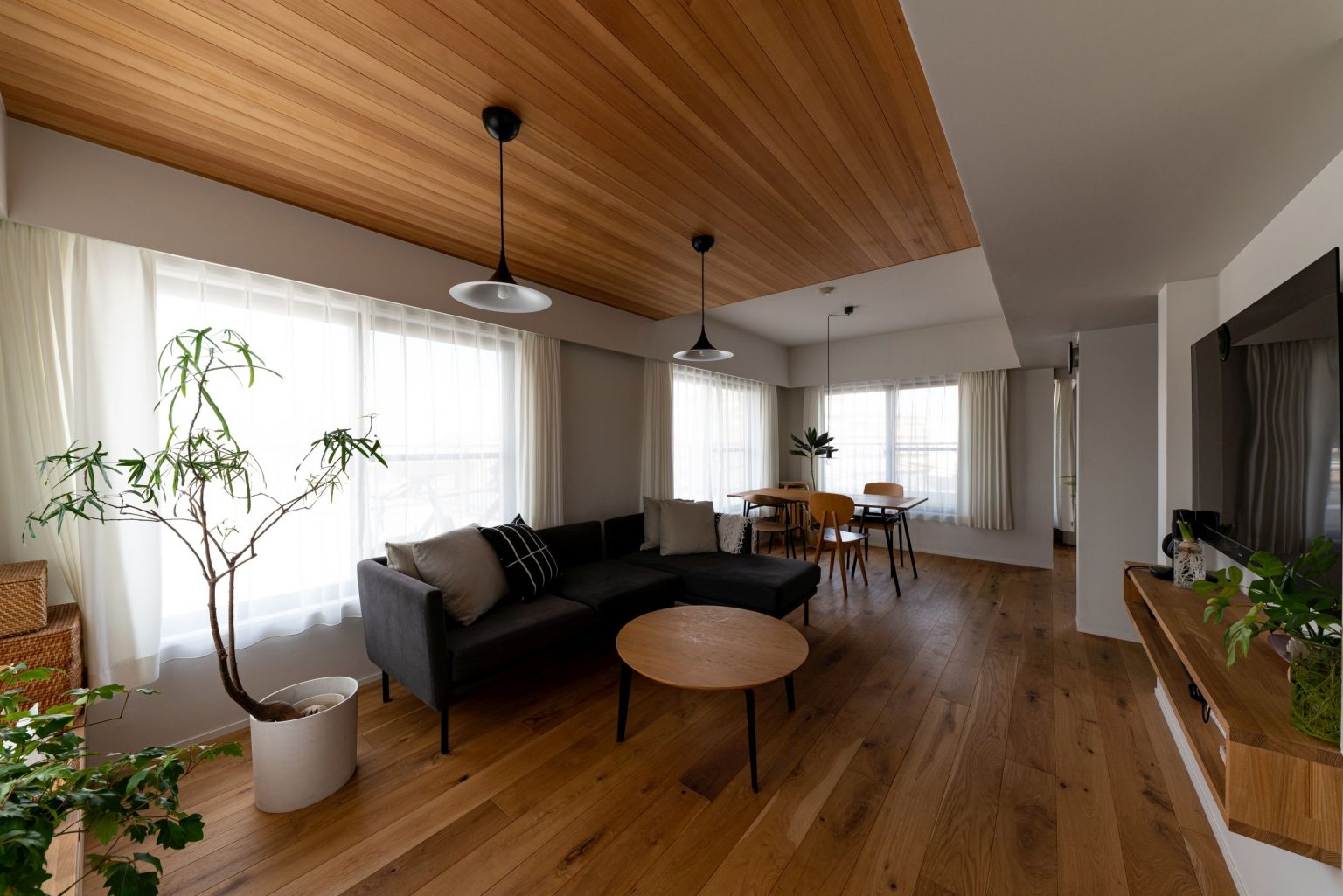 木の質感を生かした天井と床が空間をやわらかく包み込む。奥行きとリズムのあるLDKを構成。