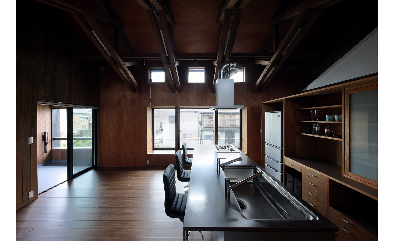 二段構成の屋根は隣地に配慮しながら自然に導かれた形で、内部ではその構造が梁や束として現れています。