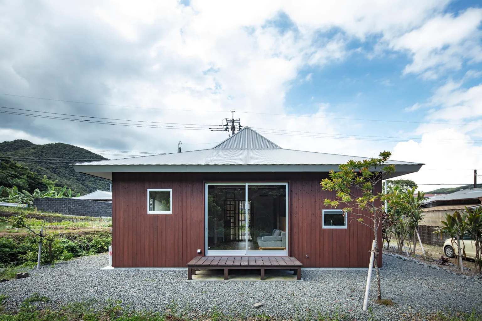 台風の多い地域に建つ屋根の見付面積を抑えた、折り曲がったような形が特徴のこの住まいは、約20坪の限られた敷地に建つ小さな木造住宅です。