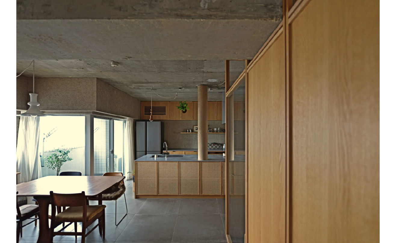 内装には構造体のコンクリートを現しとし、床には大判タイル、壁には木毛セメント板を採用。タモ材のフレームで構成された建具は、ガラスと木パネルを組み合わせ、見せる・隠すのバランスを取っています。