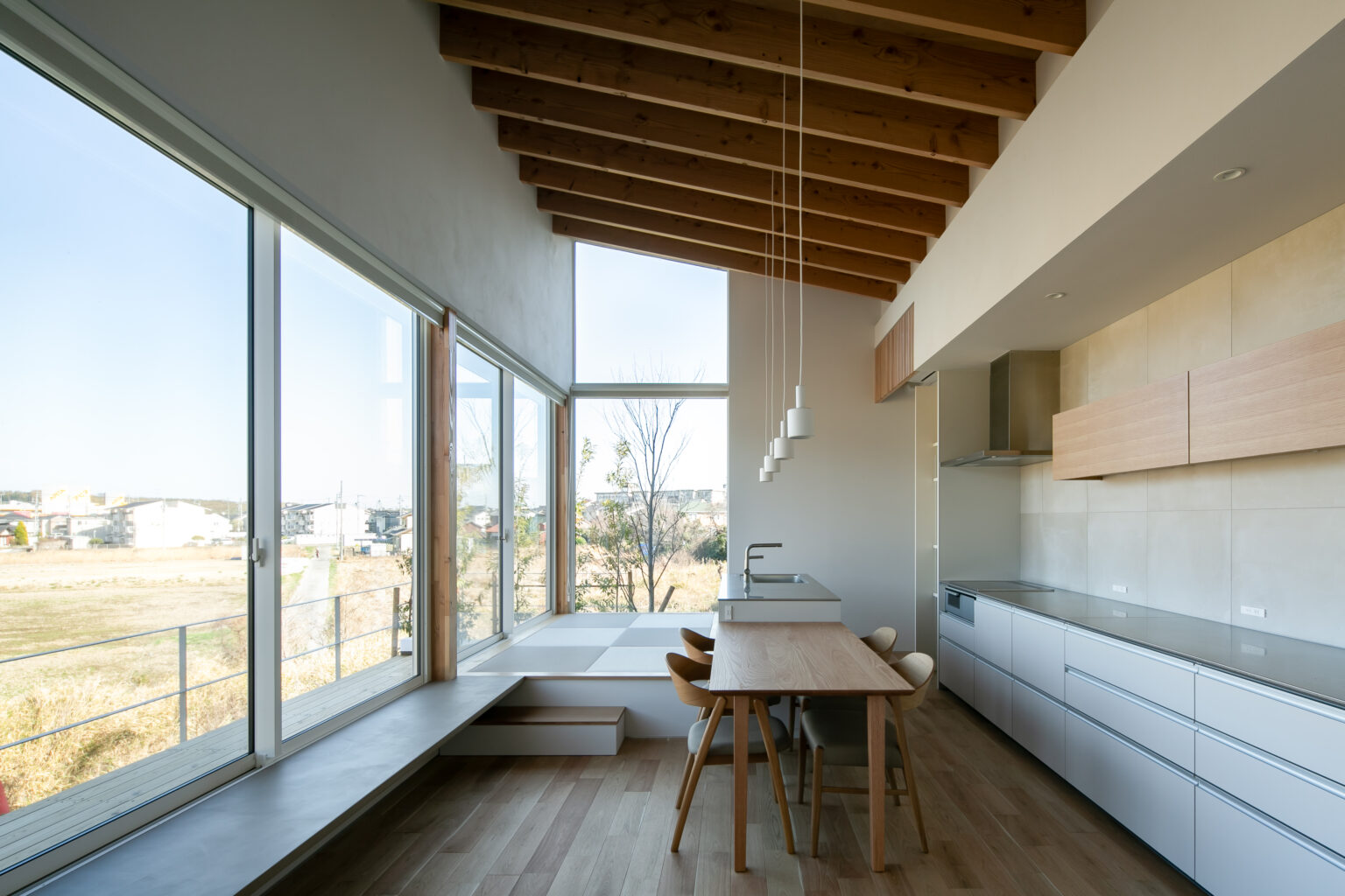 外に広がるウッドデッキは、窓から一段下げた場所に設けることでデッキが隠れ、田園風景を遮りません。風景がより美しく見えるよう、敷地の高低差を活かし、水平ラインを強く意識したデザインです。
