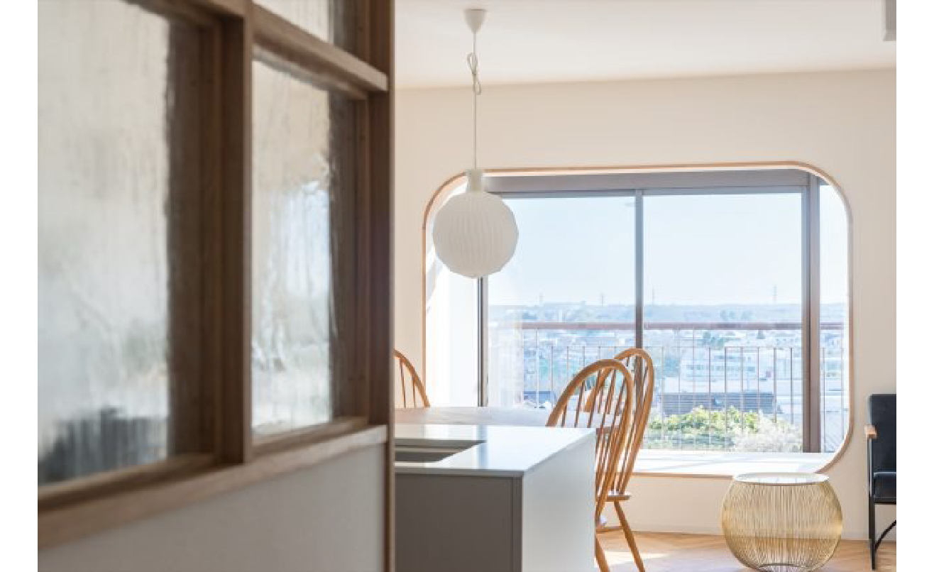 リビングは既存のサッシ部分をアール型の額縁として再構成し、景色を一枚の風景画のように切り取る窓へと転換。