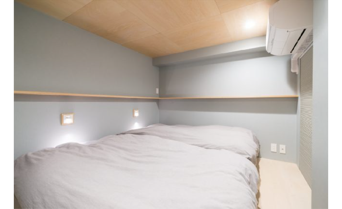 寝室は「旅館のように落ち着く空間にしたい」というご要望から、シナ合板で天井と床を挟み込み、木に包まれるような構成。一段上がる小上がりや簀床のベッド下収納など、限られたスペースを最大限に活かす工夫が施されています。