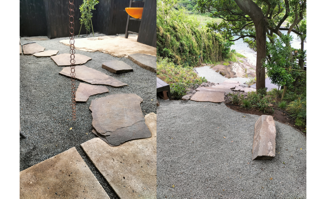 敷地は駐車場から海辺まで高低差15m。蹴上30cmの険しい地形をそのまま生かし、総重量30tの自然石を昔ながらの手動で行う「三又(サンマタ)」、「チルホール(牽引装置)」などの工具を利用してテコの原理で10cmずつゆっくり降ろし階段や飛び石を構築しています。
