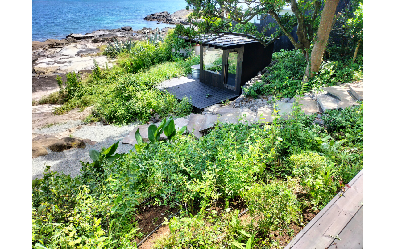 サウナ小屋は海へ向かって縦に走る岩礁のラインに合わせて配置し小屋の角度が風景の読みを反映。