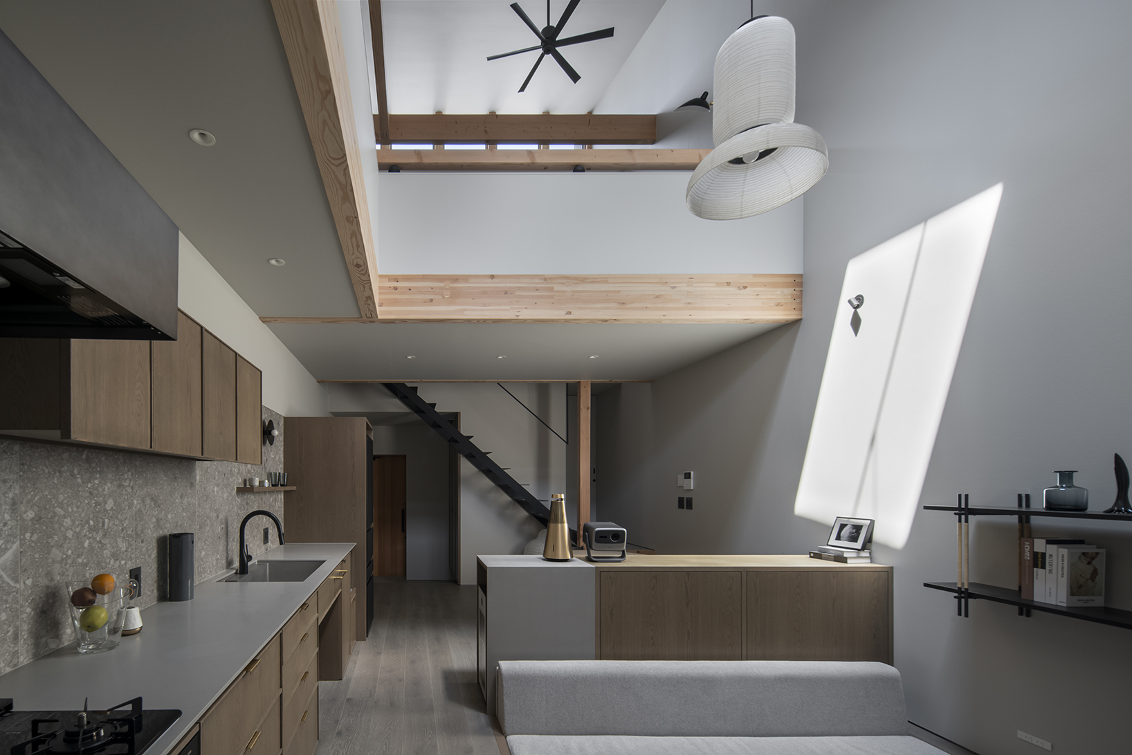 1階には窓を設けず、2階の高窓から落ちる光がLDKを中心に家全体へ広がるようにつくられています。閉じた外観からは想像できないほど、明るくのびやかな室内が生まれました。