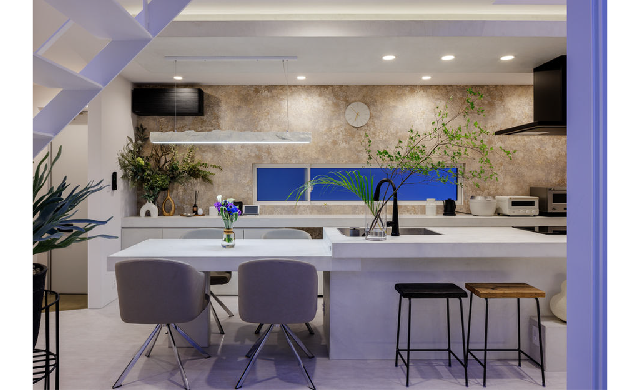 内部の中心となる吹き抜けリビングは、中庭の壁の高さを読み込み、十分に採光が落ちるように断面を調整。キッチン天板からバックカウンター、ダイニングテーブル、AVボードまで白いモールテックスで統一し、空間を貫く一体感を生み出しています。