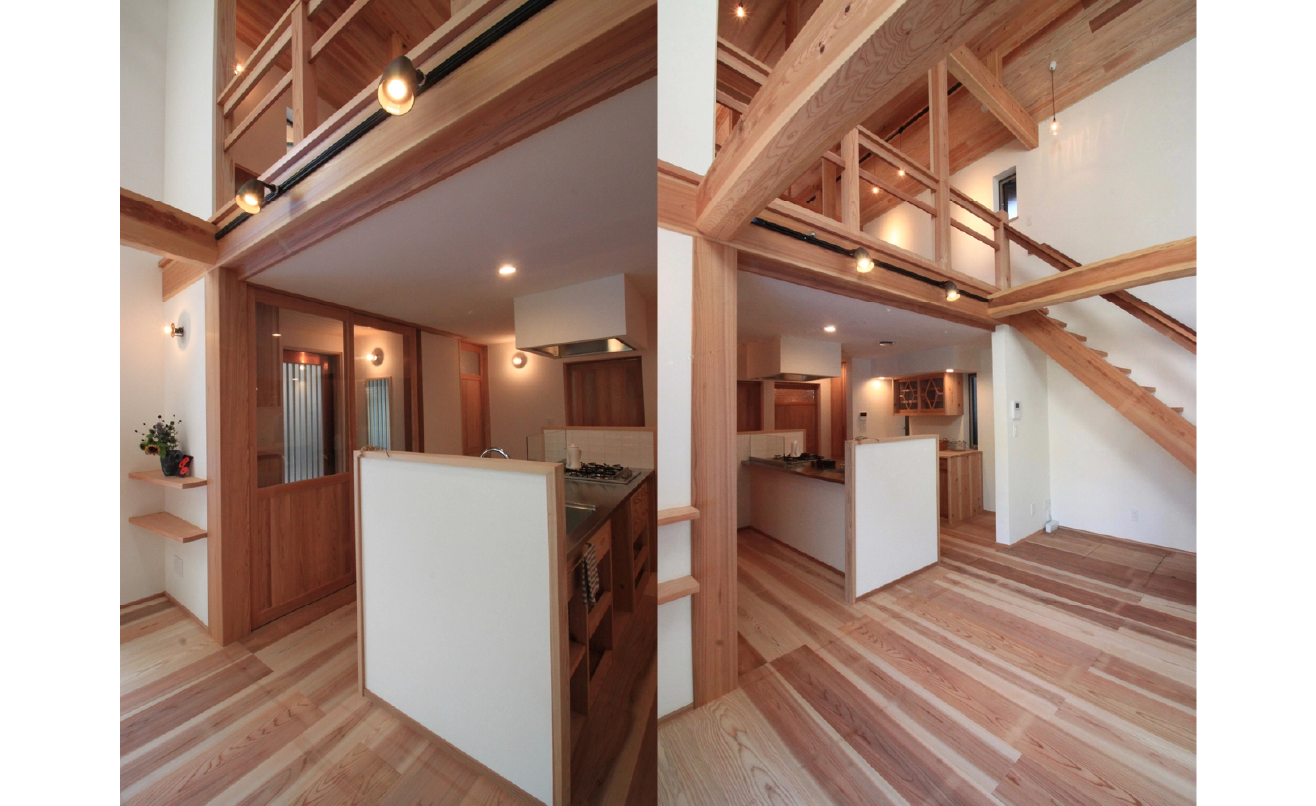 素材選びにはお父様の原風景が色濃く反映。和歌山出身で、ご実家が山を所有していたという背景から、現在山を管理している方に依頼し杉の木を切り出して柱や梁、フローリングとして使用。「自分が育った山の木の中で暮らしている感覚」を大切にし、故郷の記憶とつながる素材として住まいに取り込んでいます。
