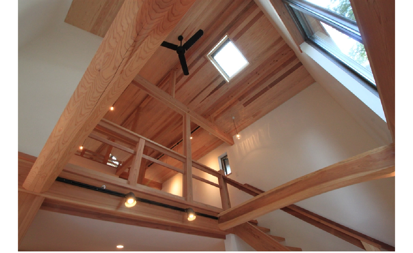 猫二匹との暮らしもあり、トイレスペースを確保しつつ、吹き抜けや丸太の梁を設けることで、上下に動き回れる立体的な空間をつくっています。
