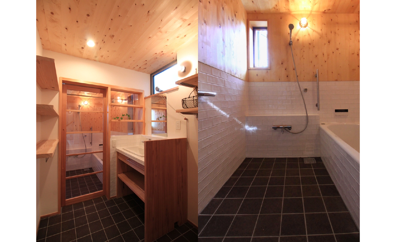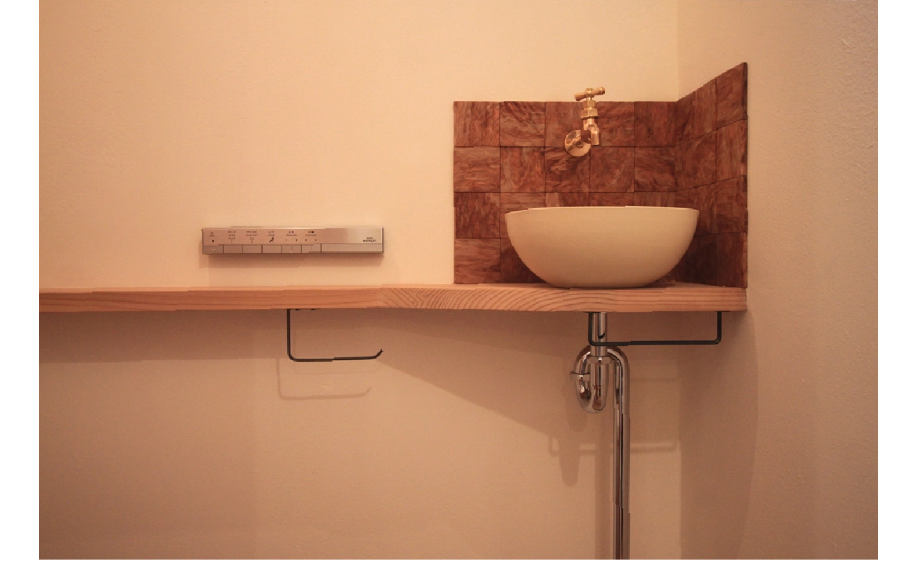 トイレの壁のアクセントとして使われた屋久杉のタイルも人との縁から生まれた素材。山の管理をしている方が作業場で作っていたものを分けてもらい、住まいの一部として組み込んでいます。設計図だけでは決まらない選択がこの家に静かな物語を与えています。