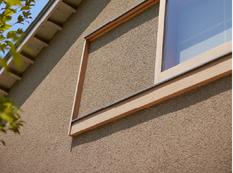 外壁仕上げには高千穂シラスの左官材「スーパー白洲そとん壁」を採用。