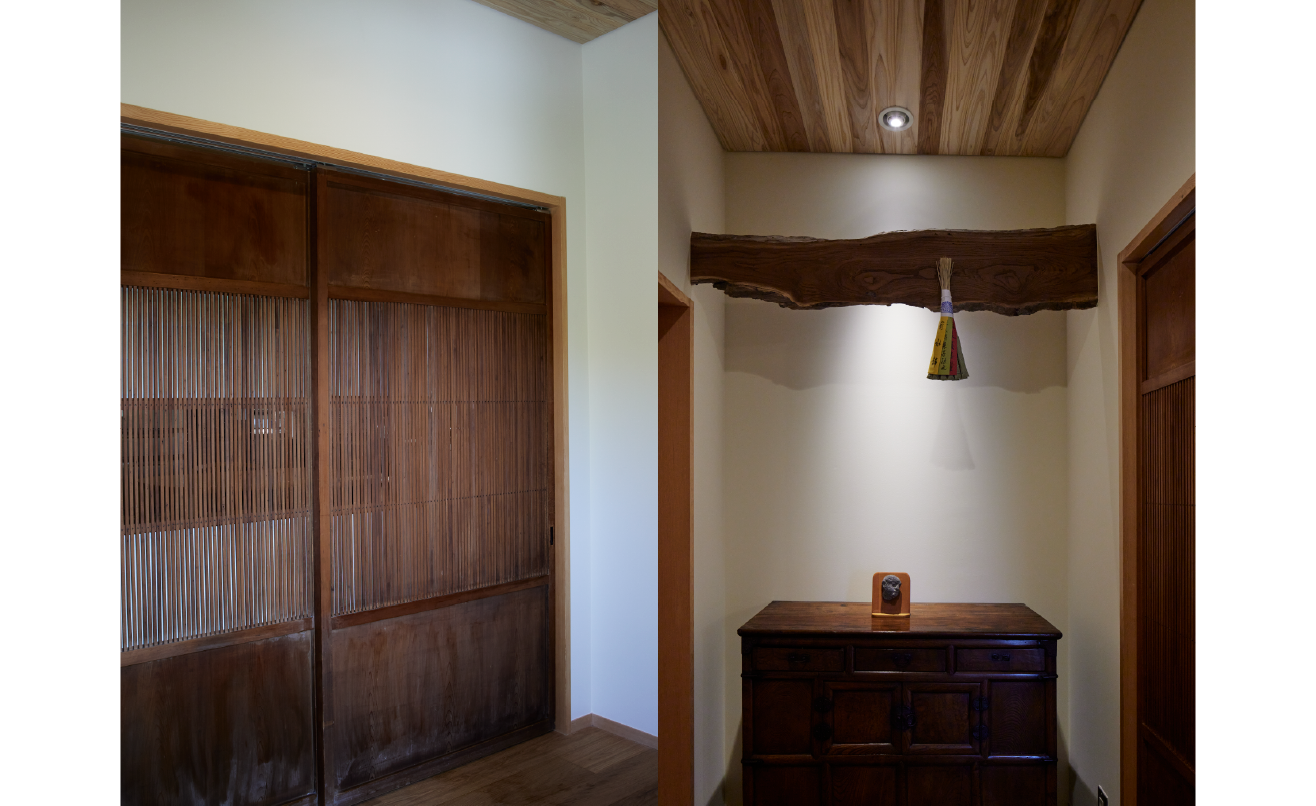 空間の骨格をつくるのは建具屋による木製建具の構成。多くの建具や造作は既製品に頼らず、空間ごとに丁寧に設えています。天井は仕上げで覆い隠すことなく架構を表し、梁や垂木そのものを意匠として見せ、素材の表情を空間の質として受け止める姿勢が住まい全体に一貫しています。