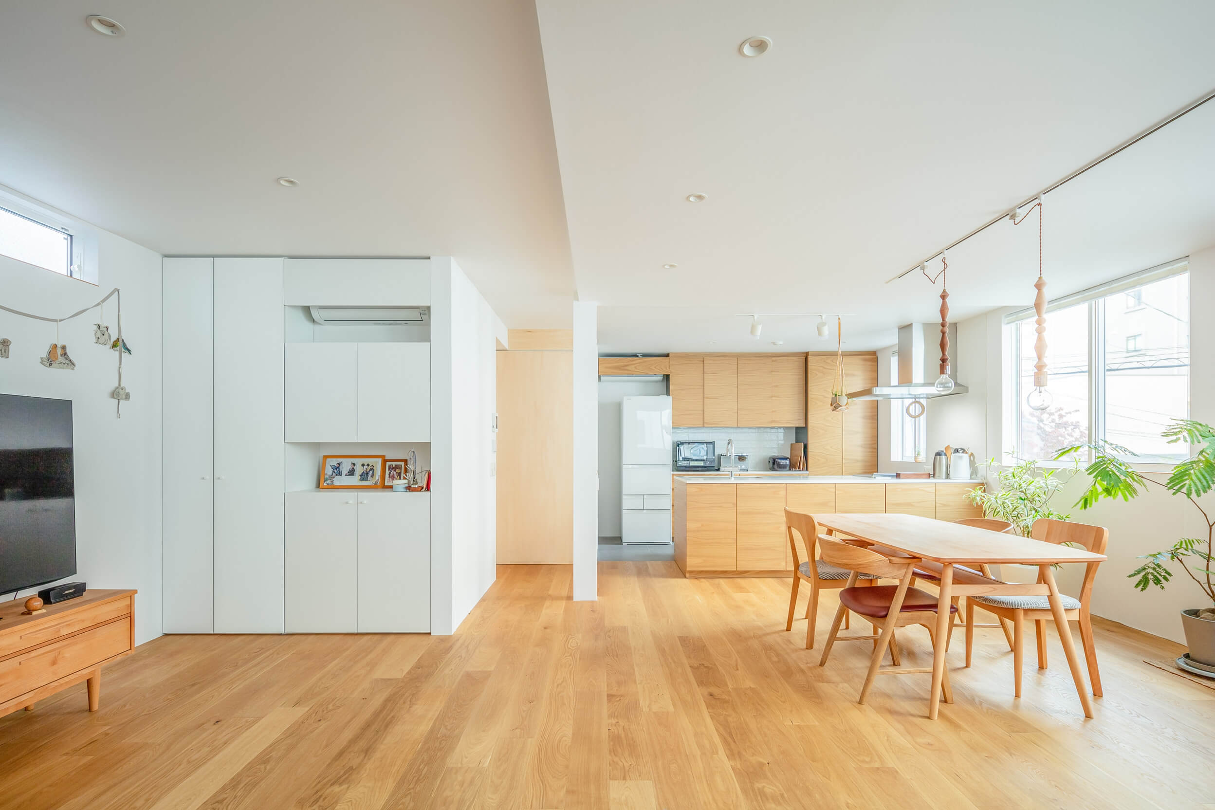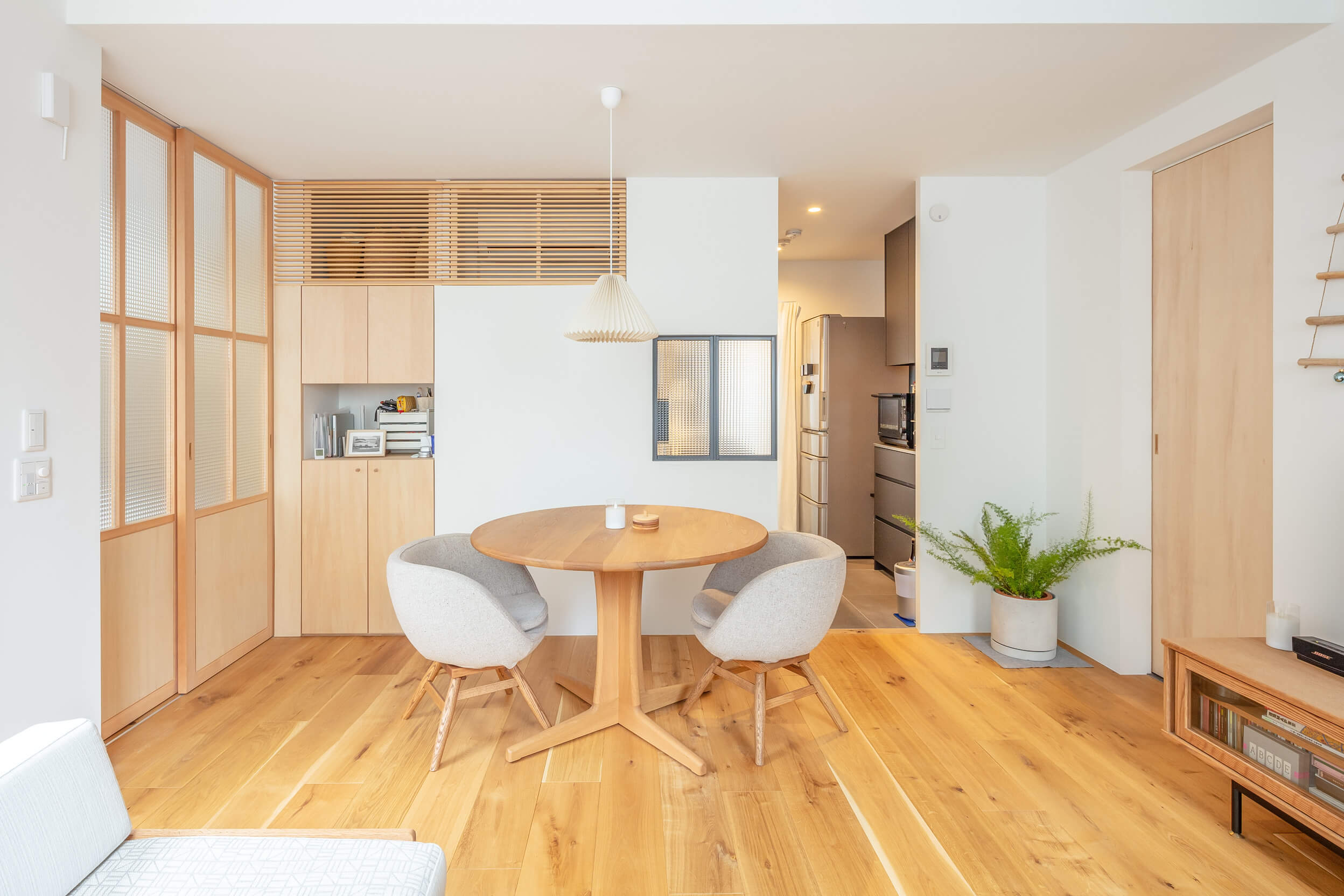 室内では、できるだけ引き戸を採用し、扉を開け放ったときに住まい全体がひとつにつながるよう計画しました。動線がスムーズになり、限られた面積でも広がりを感じられます。