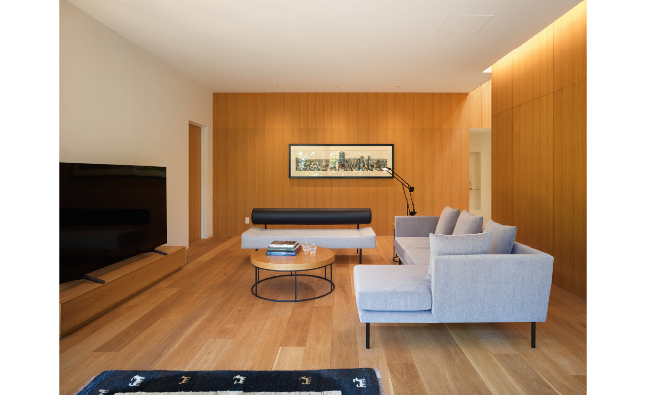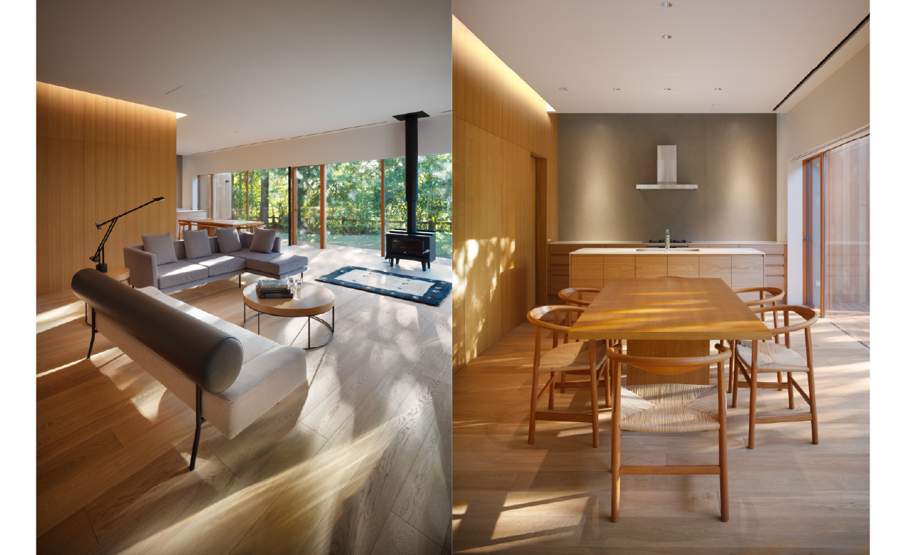 リビングの中心には薪ストーブを据え、空間の重心を明確に設定。炎を囲むように人が集まり、暖とともに時間を共有する場として機能しています。床や壁、家具にはオーク材を用い、素材感を揃えることで、大きな平屋でありながら落ち着きのあるスケール感を保っています。