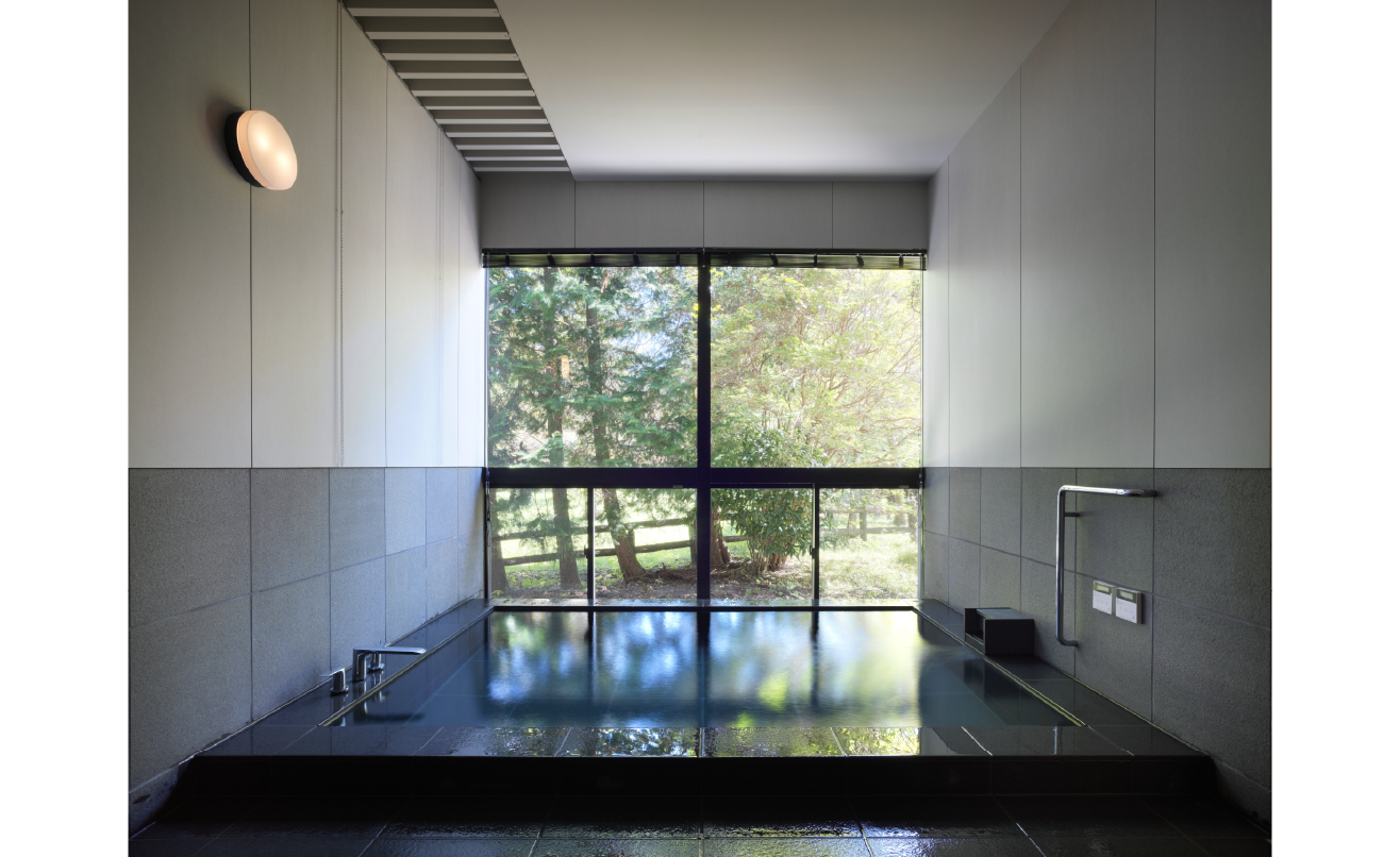 温泉を備えた浴室はこの別荘の核となる場所です。湯に浸かりながら緑を眺め、身体を温めた後は洗面空間のベンチで休む──タオルウォーマーや操作性を抑えた設備機器が、動作をシンプルにし、入浴後の時間まで含めて設計されています。