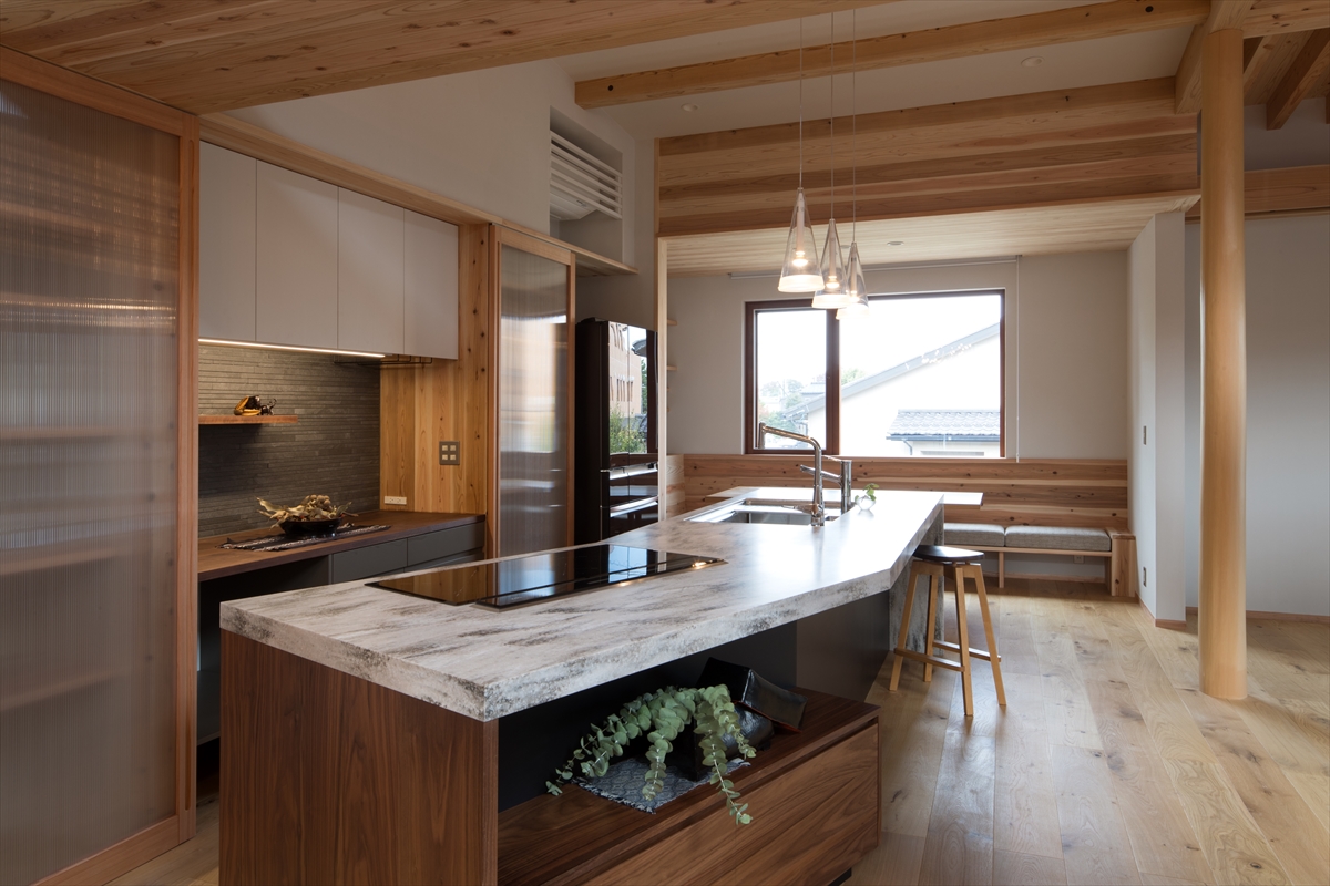 当初は既製品のV型キッチンをご希望されていましたが、住まいの形状に対してもっとゆるやかな角度にすると家族の動線にピタリと合致しため、造作キッチンとしました。デザイン性だけでなく調理の可動域が広がり、子どもの様子も見守りやすくなったと喜ばれています。さらに空間に広がりを感じさせる視覚効果も生み出しています。