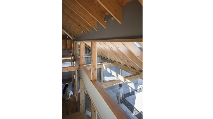 通常であれば大きな軒を支えるための柱が必要ですが、三角形で構成されたトラス構造を採用することで軒を支持し、柱のない中庭空間を実現しました。