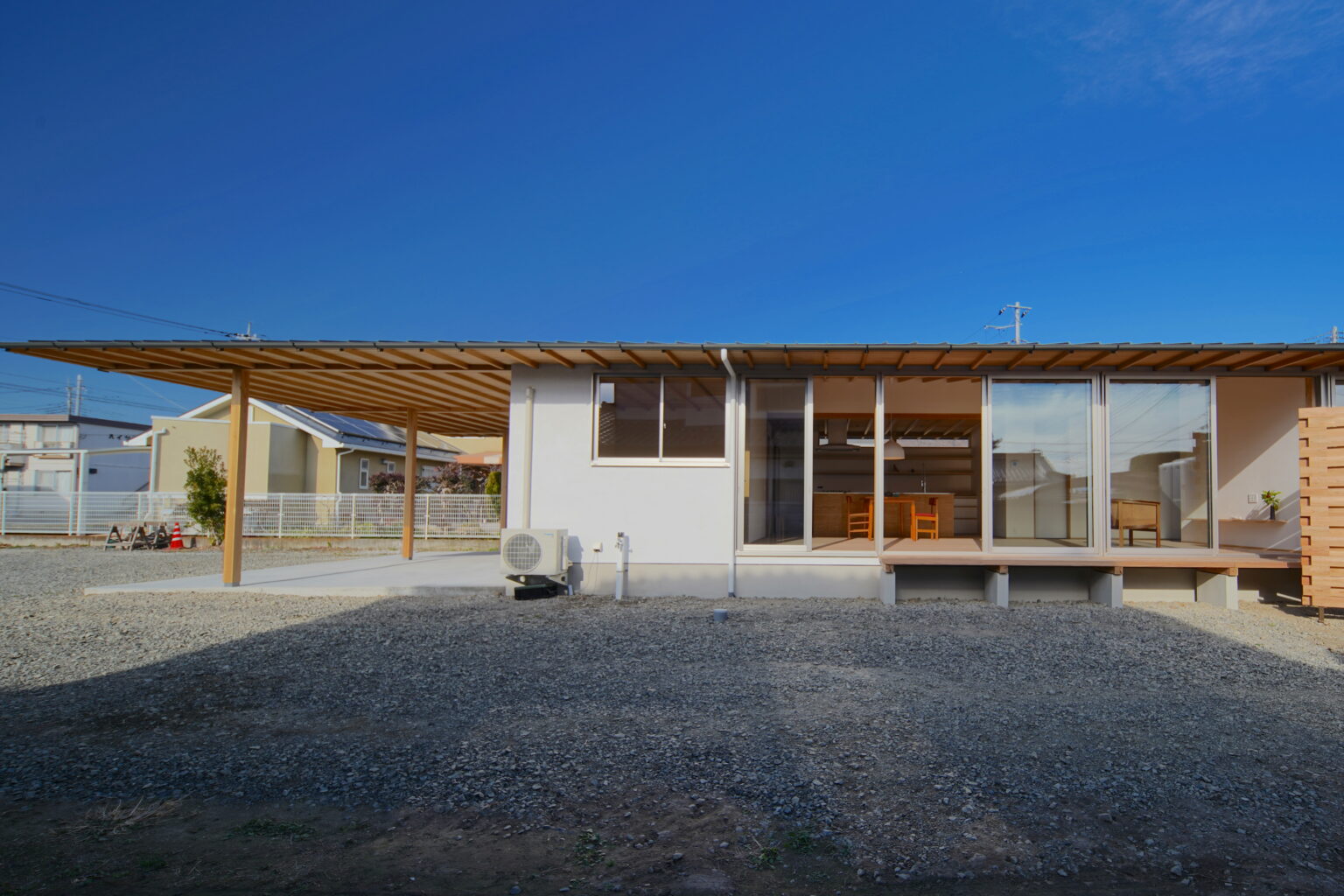 ごちゃごちゃとしないスッキリとした平面。開放的でおおらかな空間や開口部。軒先は薄くかつ、どこまでも連続してゆくようなデザイン。そして杉材の美しさと陰影が生まれるような天井。