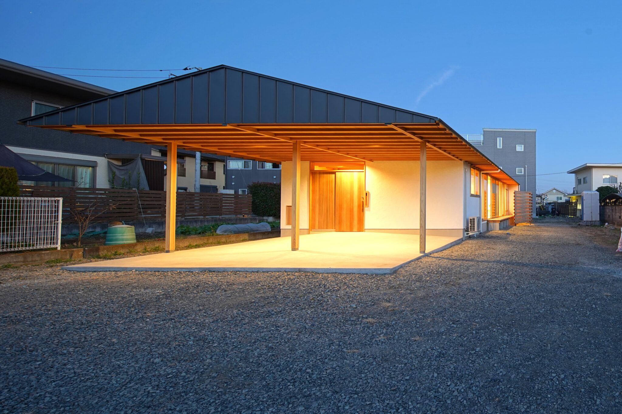 またこの住まいの特徴でもある、ガレージに大胆に伸びた屋根は、ガレージと建物とを分けて設けるのではなく、ガレージと住まいを一続きの大きな屋根の下にまとめました。要素を分けたり、後から足したりすると全体が雑然としてしまうため、最初の構成段階から一体として考えることで、構造強度や耐久性を高めています。