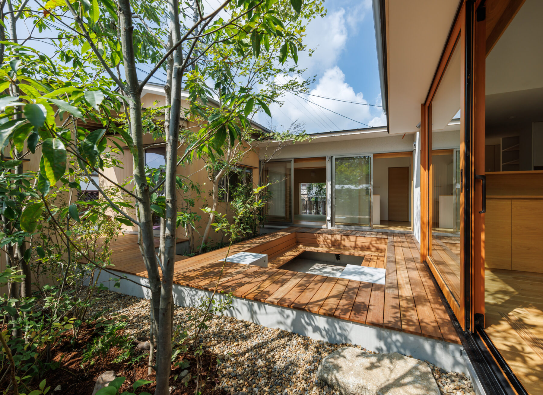 中庭はピットリビングとして少し沈み込ませ、デッキとベンチを一体化。リビングが延長するようなデザインで、家族が自然と集まります。