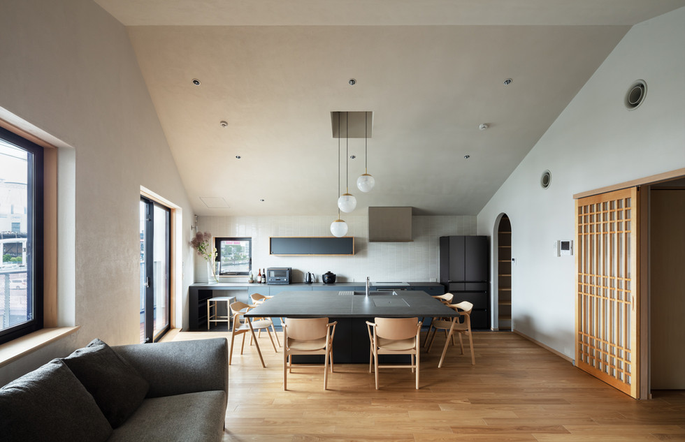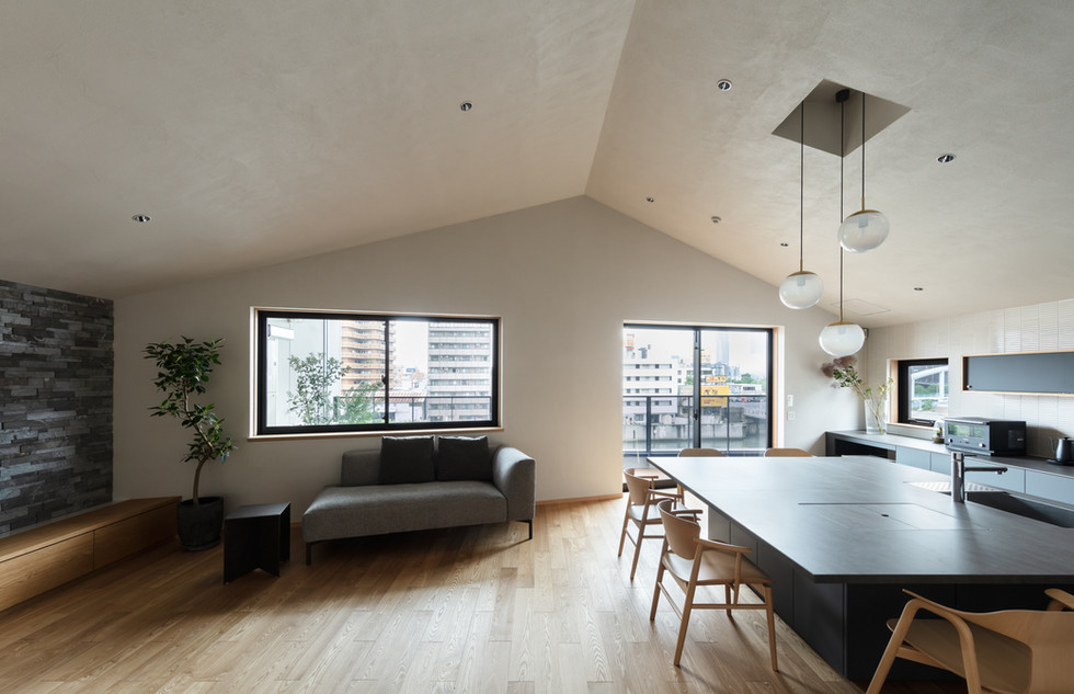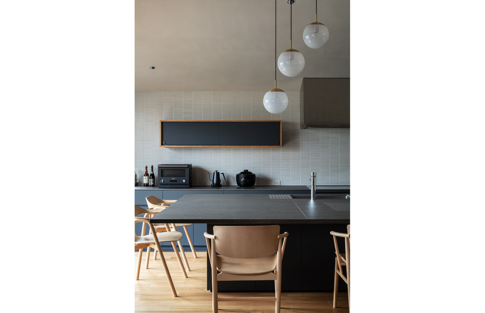 そこで本当に必要なものは何なのかを見極めて設計する必要がありました。LDKに割けるスペースを考えたときに、ダイニングテーブルセットを設置するとソファなどを置くリビングスペースがかなり窮屈になることが考えられました。そこで思いきってこのキッチンとダイニングテーブルを一体化した形を考案しました。セラミック製のキッチンカウンターの天板をそのまま広げてテーブルとしての役割も持たせ、他の場所に住む子供たちが帰省した際にも対応できる席数を確保しています。これによりリビングのスペースがしっかり確保でき、くつろげる空間が広くなりました。