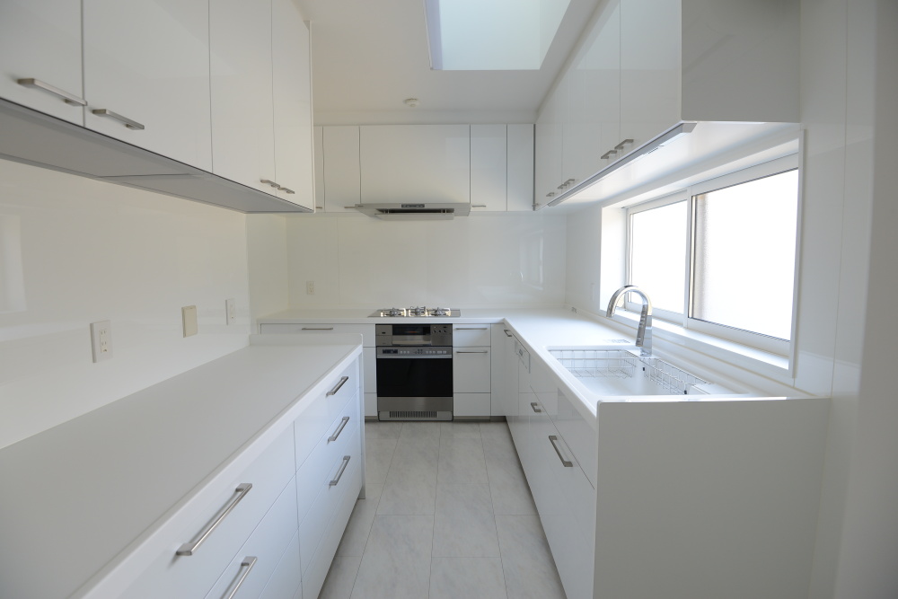 キッチンには大きな窓と天窓から光がたっぷり入り、清潔感のある真っ白なキッチンです。