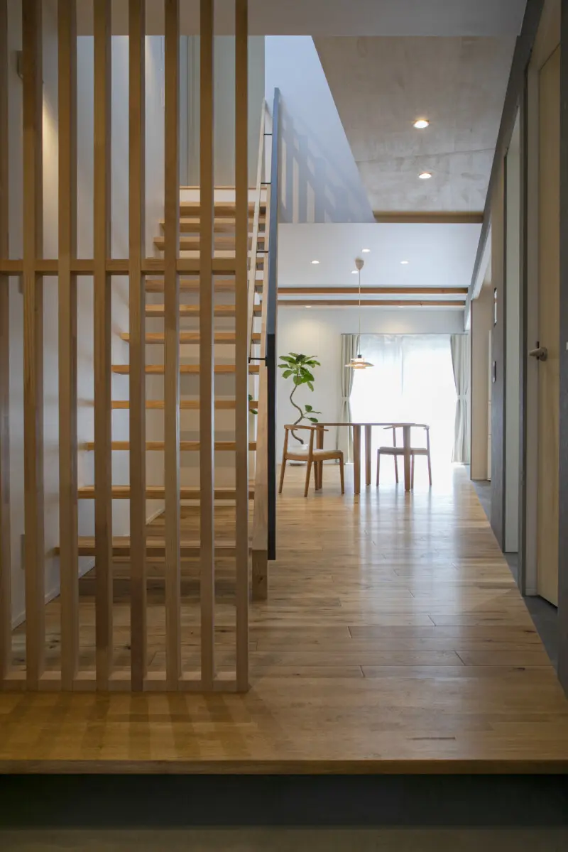 住宅密集地で横幅が狭く縦に長い敷地。いかに広く、立体的に感じる空間にするか、床、壁、天井ともに目の錯覚を利用し工夫した住宅です。
