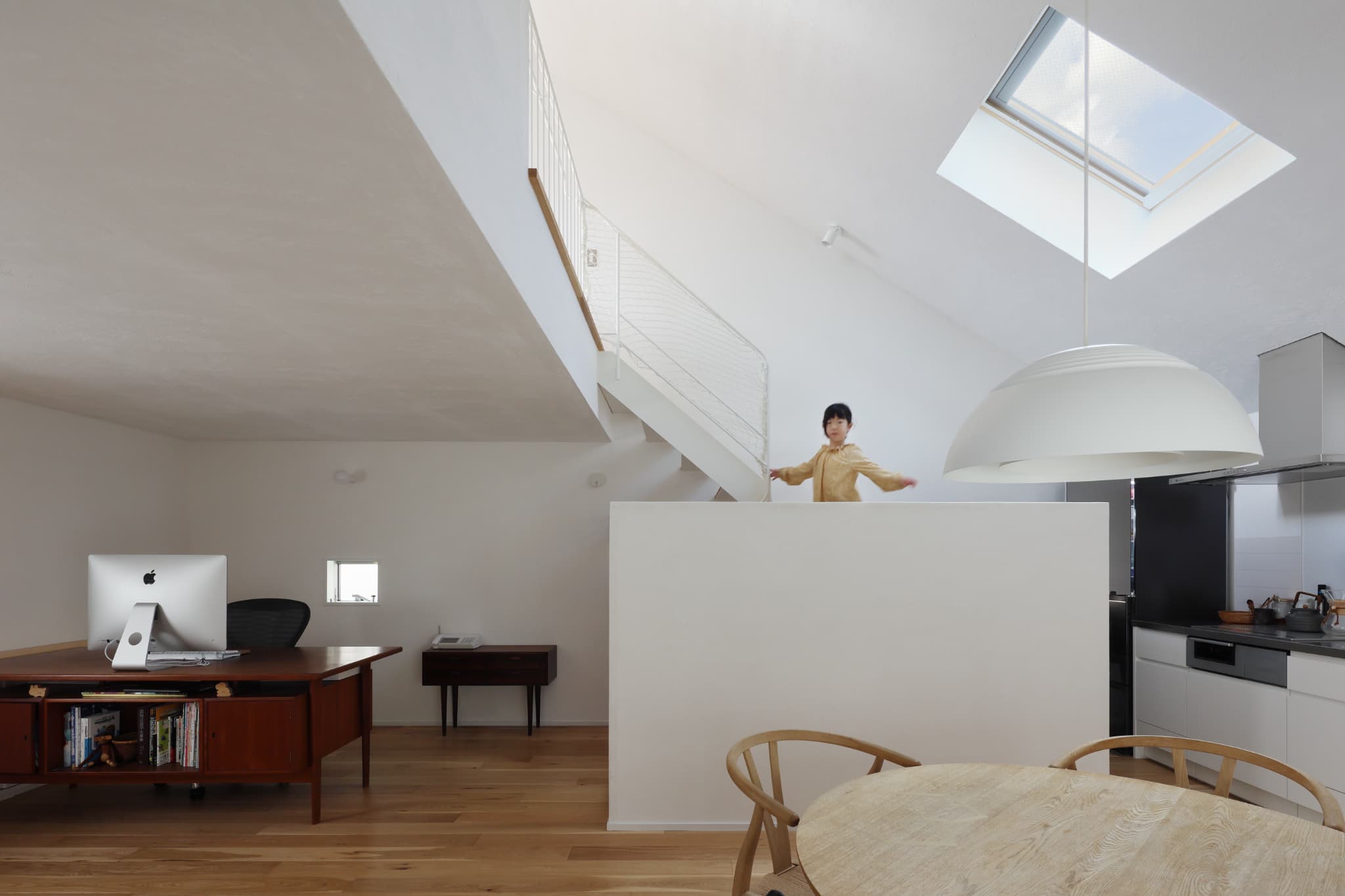 写真の『岡本の住宅』では北側のキッチンの吹き抜けに天窓を設けました。北側は直射日光ではなく安定した光が入るため設置箇所としておすすめです。光が届きにくい北側の部屋にも自然光が感じられ生活も快適になります。もちろん立地や構造により南側に天窓を設けることもあります。その場合は外付けブラインドをセットにして、日射しの調整ができるようにしています。今は断熱性能などの機能面も向上していますので、ぜひ自然光を感じられる天窓を取り入れてみてはいかがでしょうか。