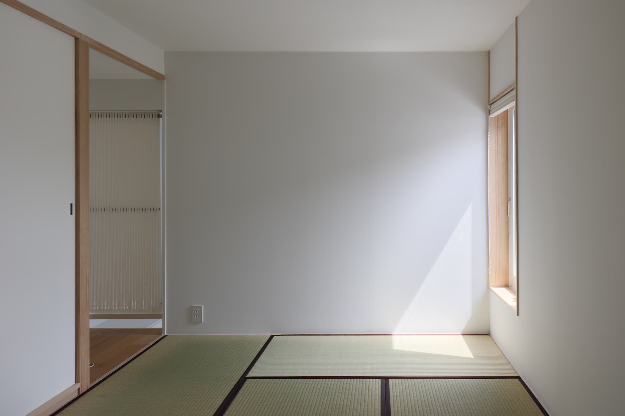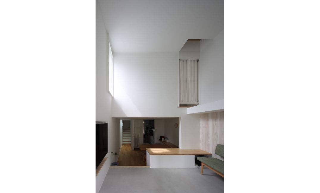 『瑞江の住宅』ではふく射冷暖房を採用し、その暖気、冷気を効率的に各フロアに届けるため、空気の通り道を工夫しました。別記事の『半地下でも自然光が届く トップライトの明かりを運ぶ光ダクト』で紹介したのですが、この住宅には3層上のフロアのトップライトから半地下に光を届けるために家の中を走る光ダクトがあります。これは自然光を反射で届けるため内側が鏡面になっているダクトです。これを光だけでなく空気の通り道としても使用しています。写真1枚目奥の階段の手前に光が落ちている箇所、これが光ダクトの開口部分です。そして写真の手前右上に見えているのがふく射冷暖房のパネルと空気の通り道であるガラリです。このダクトとガラリで吹き抜ける箇所をつくることで空気が家の中を循環できるように設計しました。