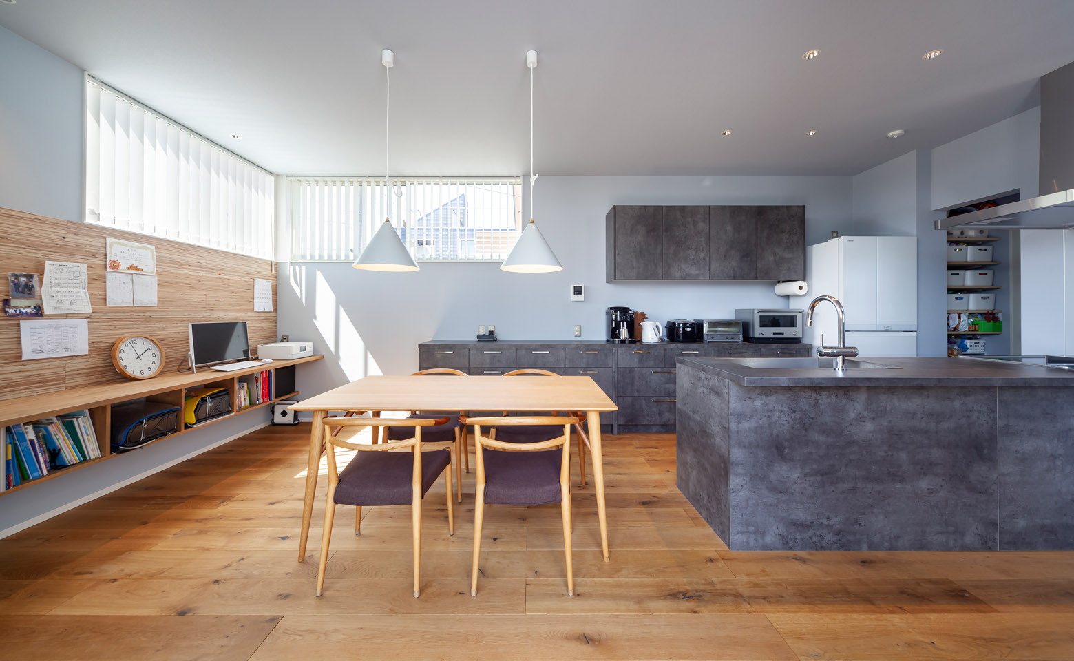 キッチン横にダイニングテーブルを配置する場合、どうしてもキッチンに存在感が出てしまうため、キッチンの存在感を活かすデザインをご提案しました。