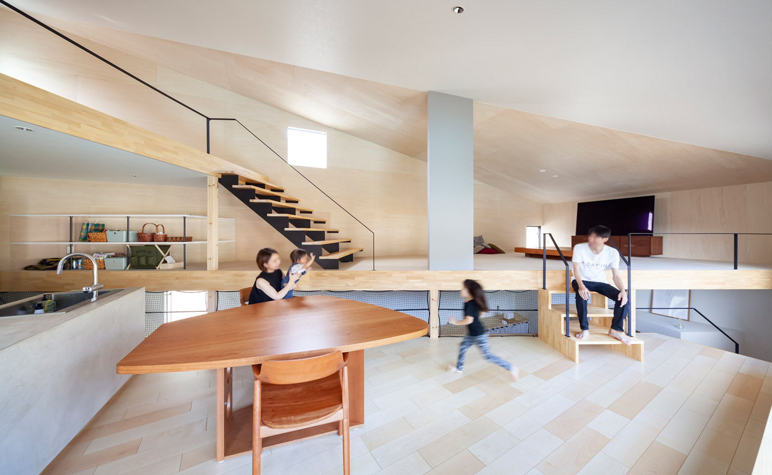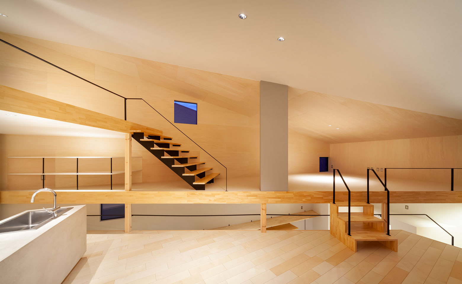 1つ1つの四角い部屋は作らず、住宅全体を対角線で区切り、床を1m程ずらし段差をつけることでエリア分けした、スキップフロアのワンルーム住宅。台形に変形した狭小敷地いっぱいに設計することで、広さを最大限に活用しました。