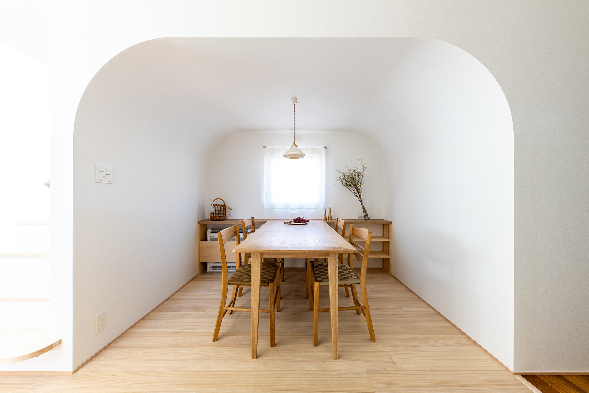 「こもり感のある場所にして欲しい」というお客様のご希望から、天井から壁をアールのデザインにすることで、かまくらのようなダイニングをご提案しました。