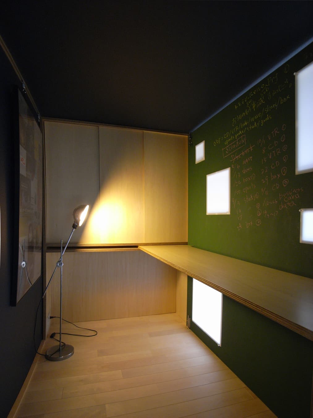 壁面に収納されたL型間仕切り壁を引き出して、引戸を閉めると1.5畳の部屋をつくることができます。1.5畳のスペースには壁面に収納があり、折りたたみ式のカウンターデスクを設置することで、書斎として利用できます。