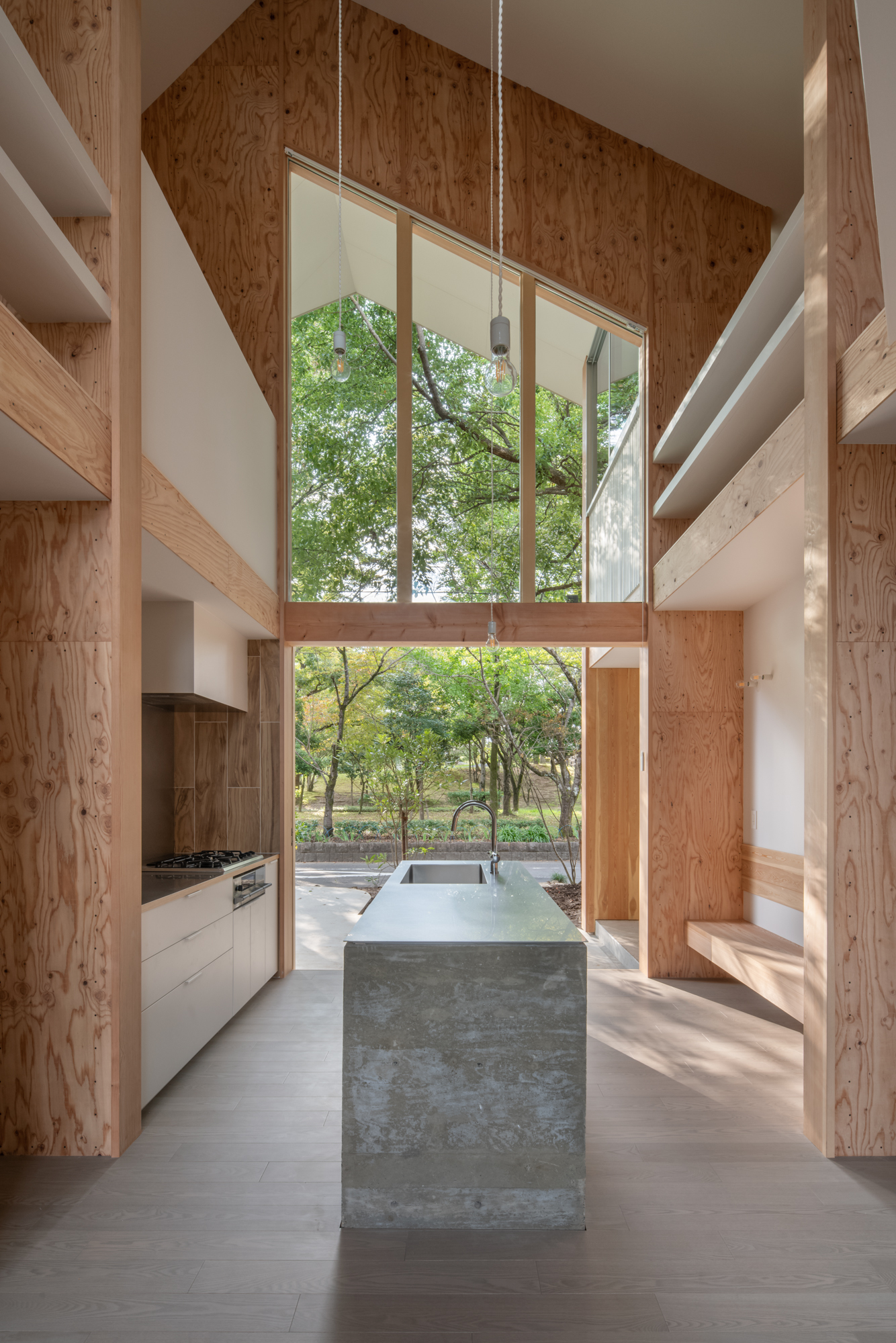 ダイニングキッチンの真ん中に吹き抜けをつくり、景色に空間がつながるよう設計をしています。