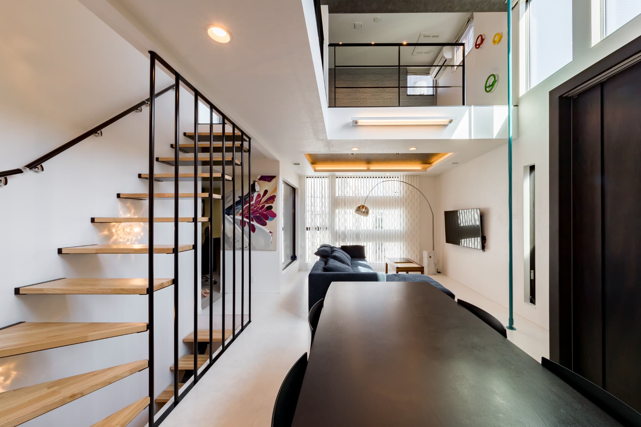 都会的で開放的なデザインの住宅ですが、吹き抜け部分にのぼり棒とDECO バブルズというボルダリングができる室内アスレチックを設置しています。のぼり棒は2階と3階の吹き抜け部分をつないでおり、3階から伝って降りてくることができます。ご主人は登るほうも試されたようですが、大人にはなかなかハードだったようです(笑)。DECO バブルズはアクティビティだけでなく、3階と吹き抜けの上部スペースをつなぐハシゴ代わりの役目も担っています。この箇所に関しては施主の方と相談の上、割り切って他のハシゴなどの設備を設けなかったので、上がるためには必ず運動をすることになります。まさに『アスレチックする家』です。