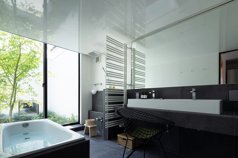 浴槽は庭が見える洋風バスタブを、天井には水や湿気、カビに強い衛生的なセラール(メラミン不燃化粧板)を採用。つるつるした表面が、中庭の緑を映しだし天井にまで広がります。浴室に緑の気配を取り込むことで、浴槽に入ると自然と目線が上を向きます。