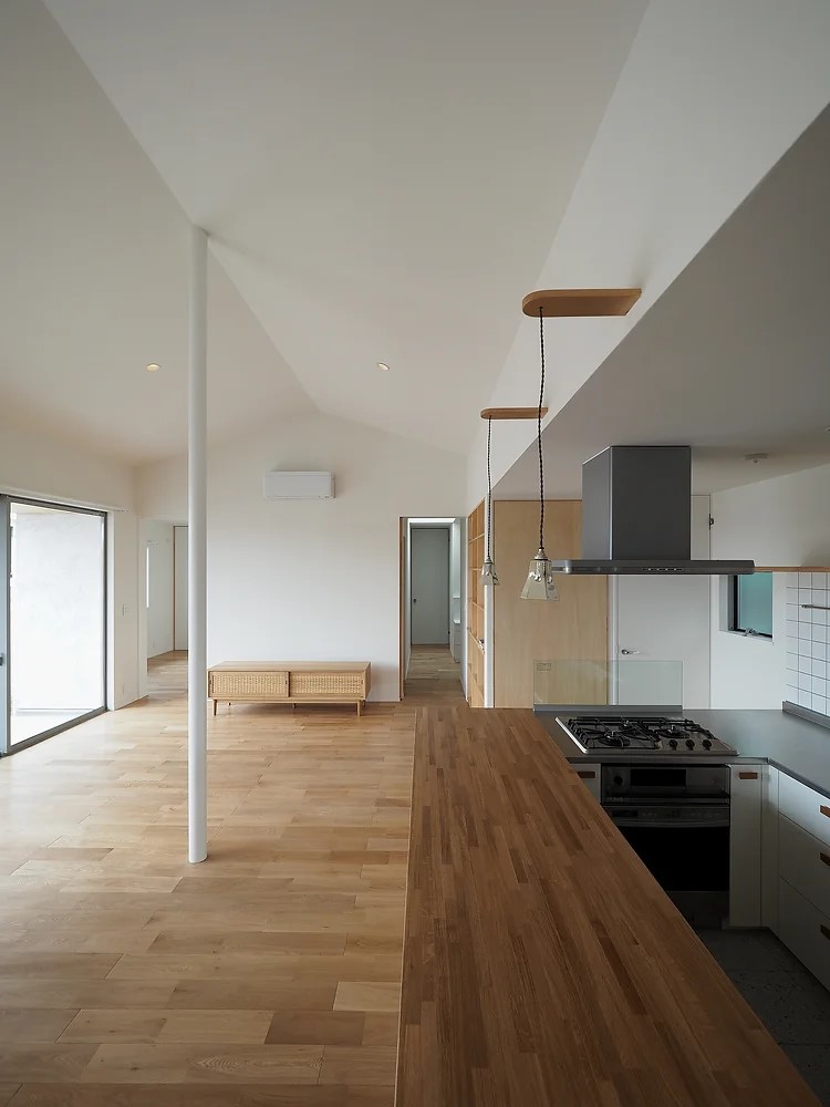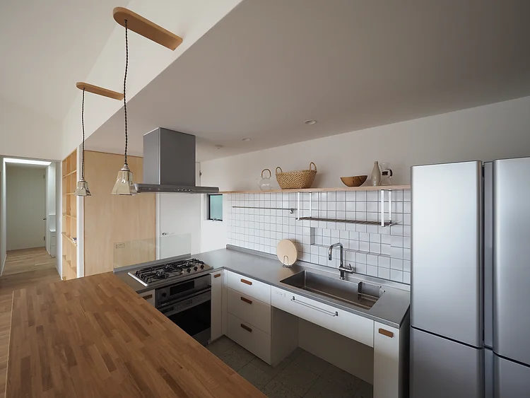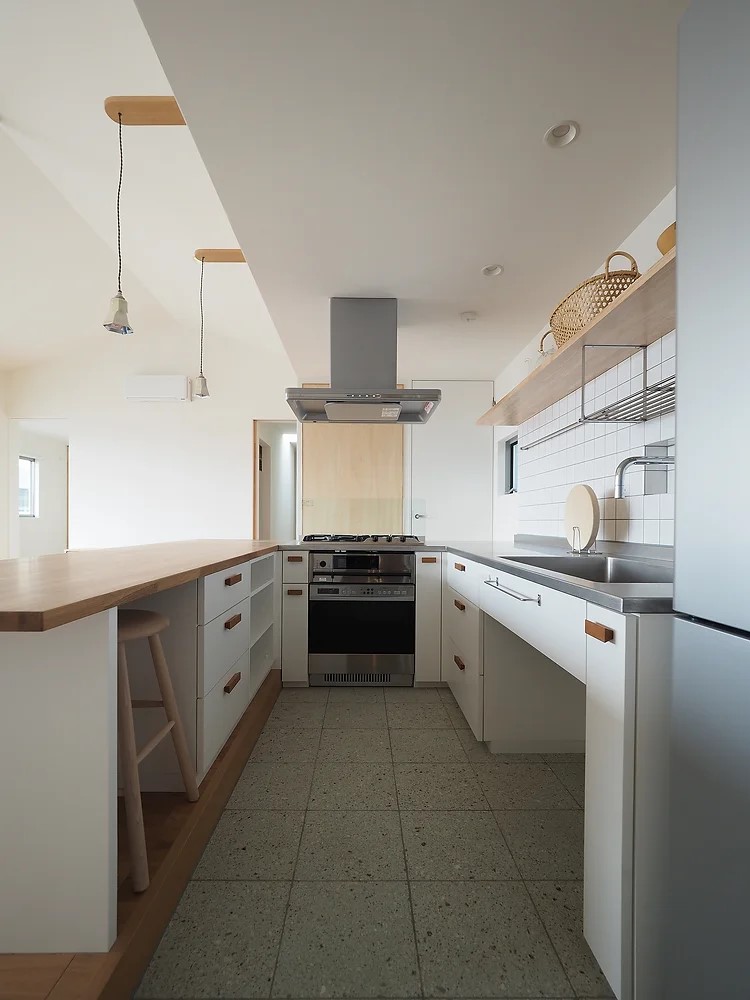 コの字型キッチンは、パンが焼けるオーブンや火力が微調節できるガスレンジの設置を中心に設計。パン屋さんをされているので、自宅キッチンでも試作品や研究が出来るよう、ある程度大胆に使えるよう使い勝手を考えています。木製のキッチンカウンターでは、試食や小さなお子さまと気軽に軽食を楽しめます。