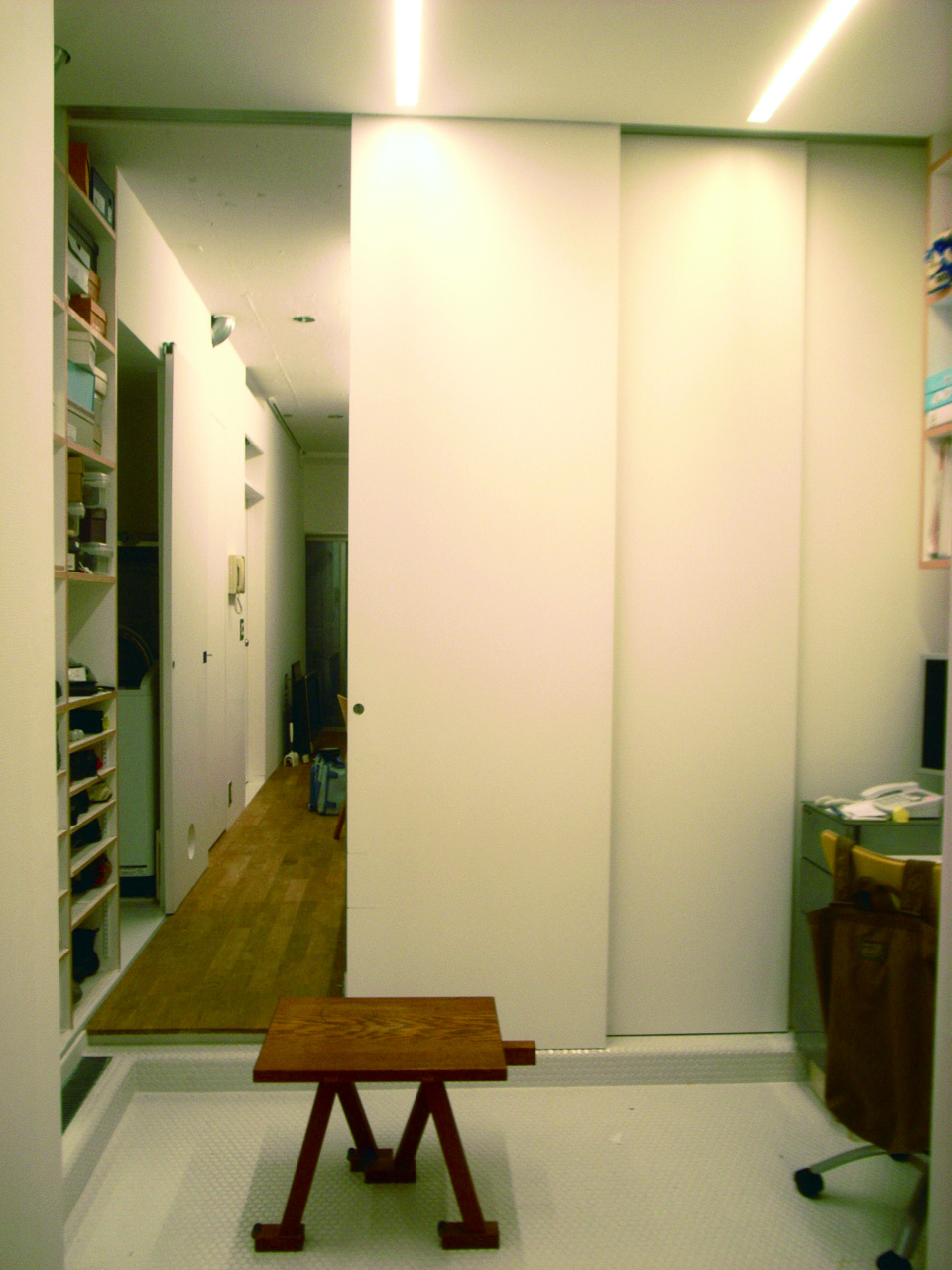 この住宅は、玄関と事務所を兼ねています。少し広めの玄関スペースだったため、右端を事務所として仕事が出来るよう、書斎スペースを作りました。靴箱も将来的には書類棚や事務用品収納など幅広く対応できるように造作しました。